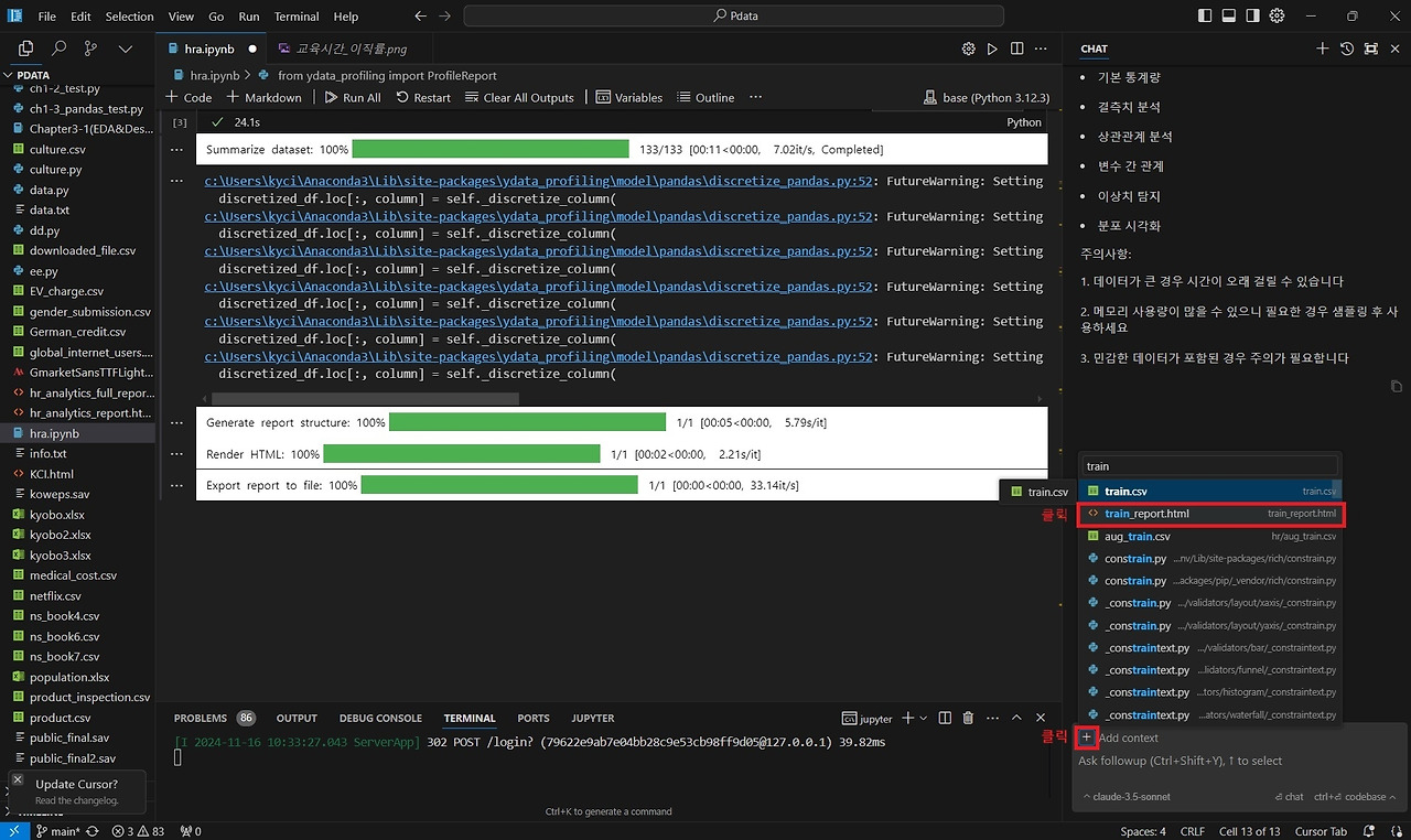 이와 같은 자동화 EDA 파일 내용을 Cursor AI에 전달하기 위해 채팅 입력창 왼쪽 상단의 '+' 버튼을 클릭한 후 'train_report.html'을 입력하여 검색합니다(폴더에 상관없이 검색됩니다). 파일이 나타나면 해당 파일을 클릭하여 업로드합니다. 파일을 업로드하면 Cursor AI Chat은 해당 파일을 참고하여 답변을 제공할 수 있습니다. 다음으로, 멘션 기능을 사용하여 해당 Kaggle 데이터가 설명된 URL을 추가로 첨부합니다. 두 가지 자료를 참고하여 어떤 분석을 할 수 있을지 아이디어를 요청했습니다.