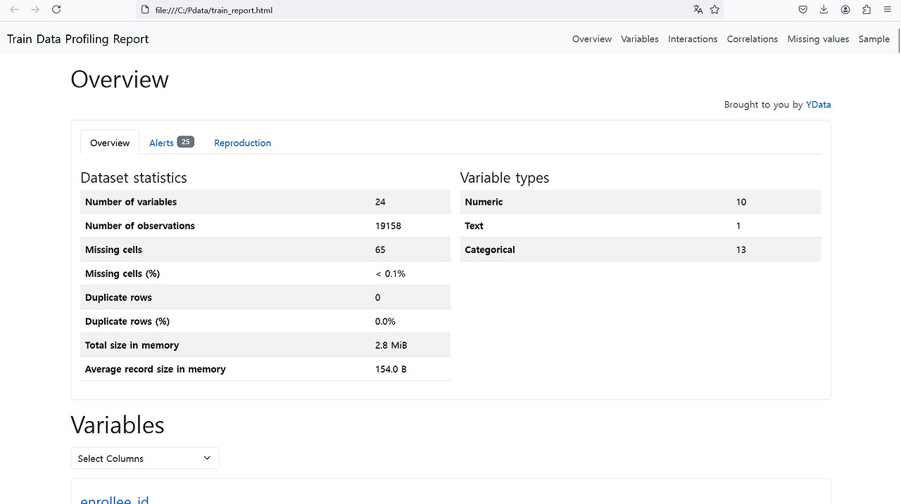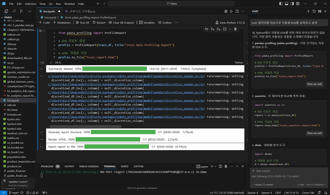 Cursor AI가 추천한 자동화 EDA 프로그램인 ydata-profiling(Pandas-profiling)을 활용하여 자동화 EDA를 실행합니다. Cursor AI가 제공한 코드를 살펴보면 자동화 EDA는 'train_report.html'로 파일 저장되는 것을 확인할 수 있습니다. 위에서 확인했던 것과 동일하게 Cursor AI에서 파일 저장 폴더로 지정된 곳(지정은 File-Openfolder 순서대로 클릭 후 폴더 지정)에 저장되어 있습니다. 해당 폴더를 확인합니다.