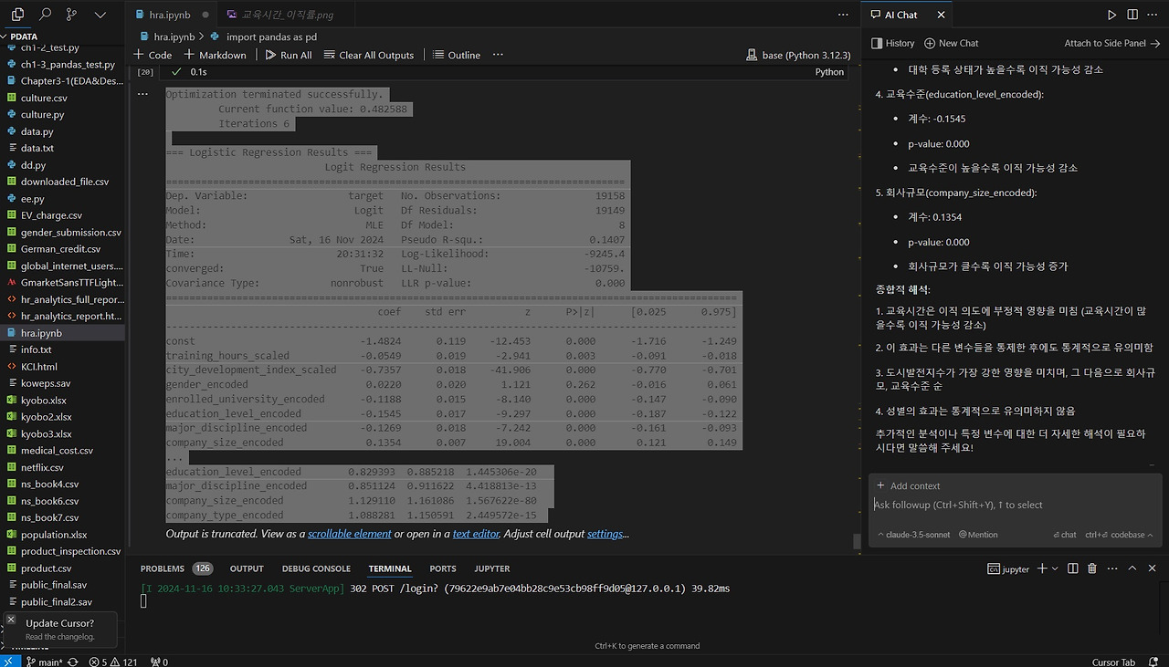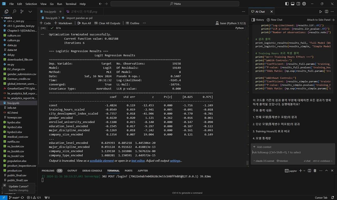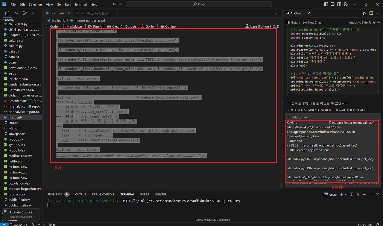 이번 분석에서는 교육 프로그램이 이직에 어떤 영향을 주는지 살펴보는 코드를 작성해달라고 요청했습니다. 코드 실행 중 에러가 발생하면, Output에 표시된 에러 메시지를 복사하여 Chat에 전달하면 Cursor AI가 에러를 수정한 코드를 다시 제공해줍니다.