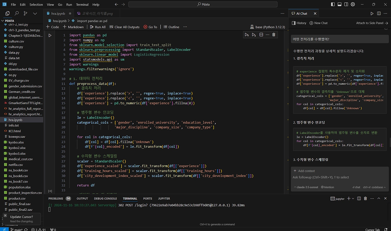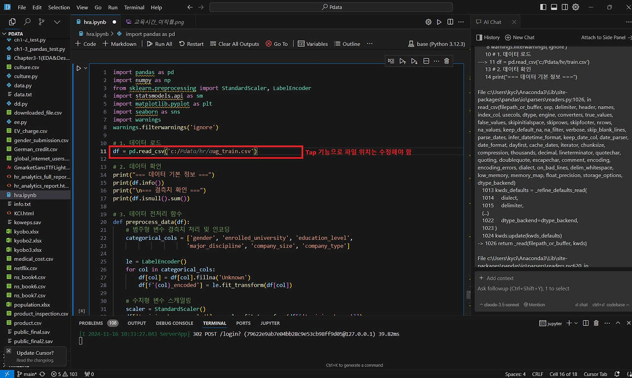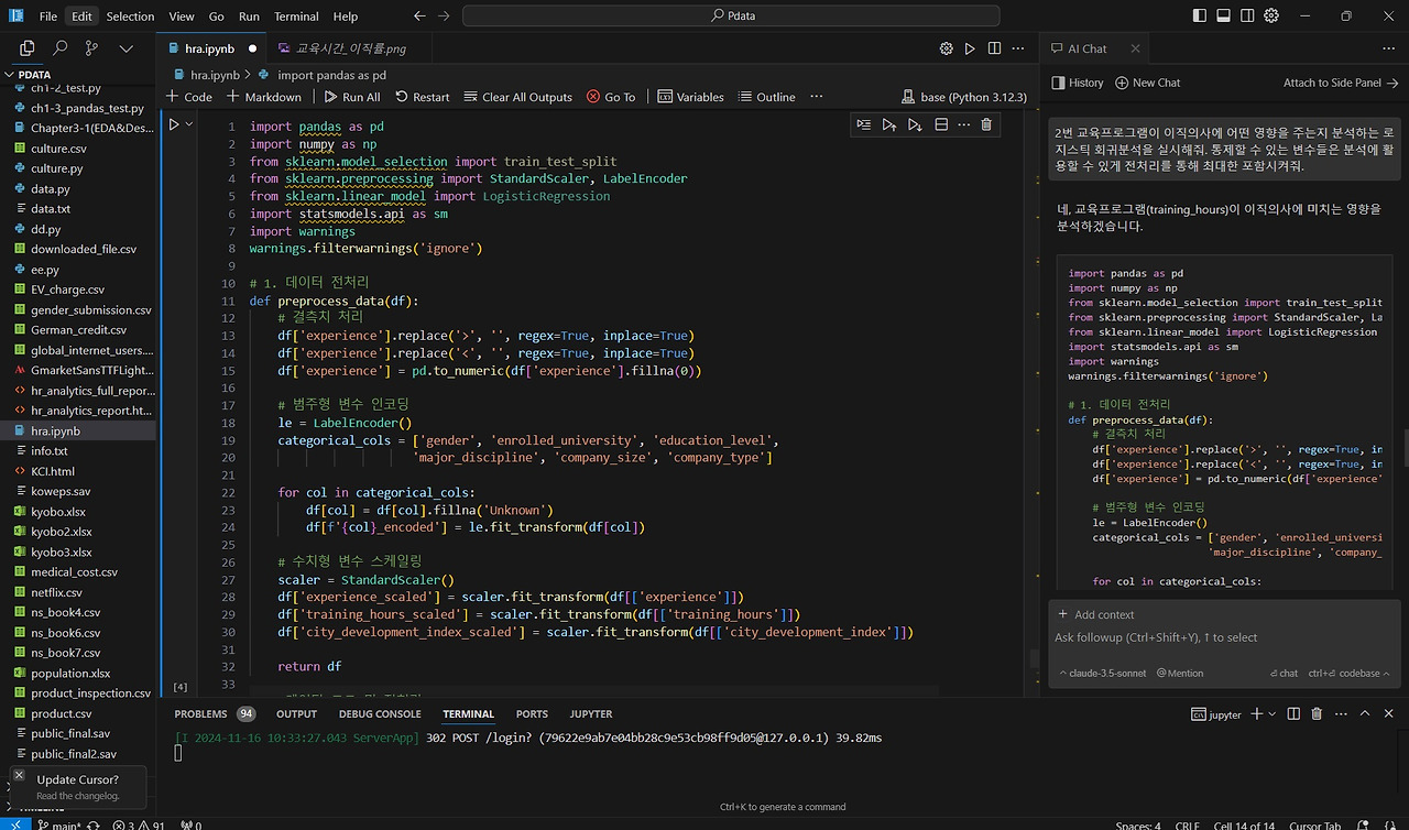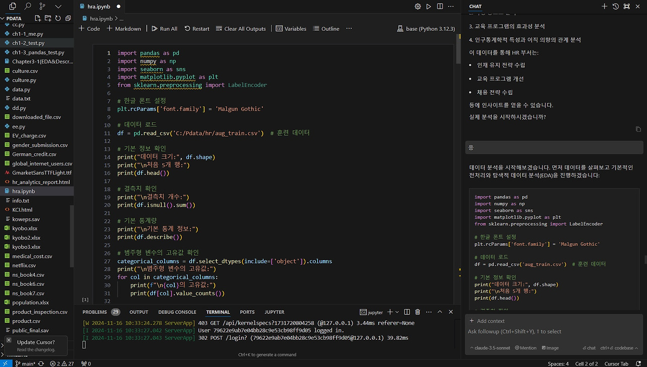 이번 분석에서는 교육 프로그램이 이직에 어떤 영향을 주는지 살펴보는 코드를 작성해달라고 요청했습니다. 코드 실행 중 에러가 발생하면, Output에 표시된 에러 메시지를 복사하여 Chat에 전달하면 Cursor AI가 에러를 수정한 코드를 다시 제공해줍니다.