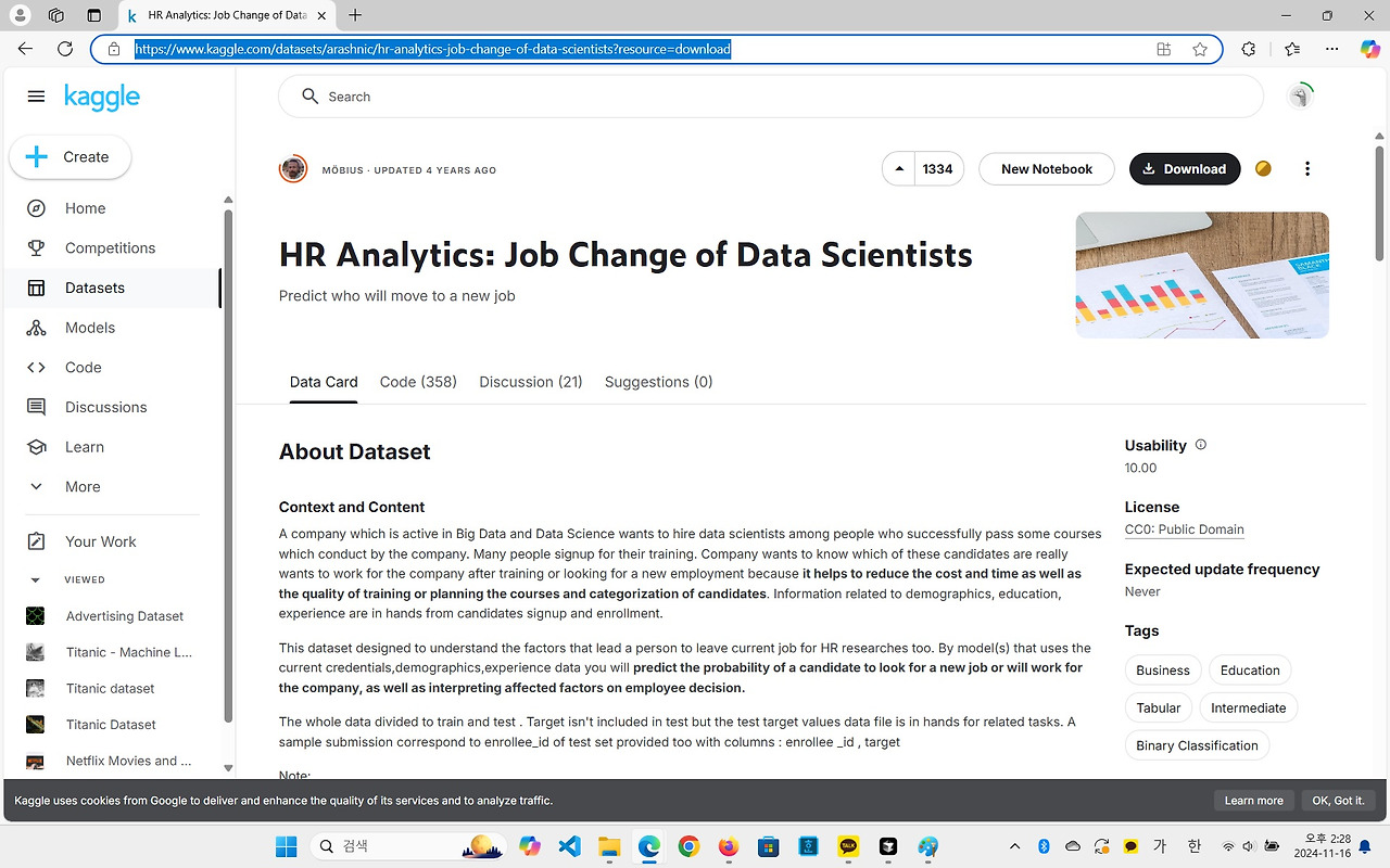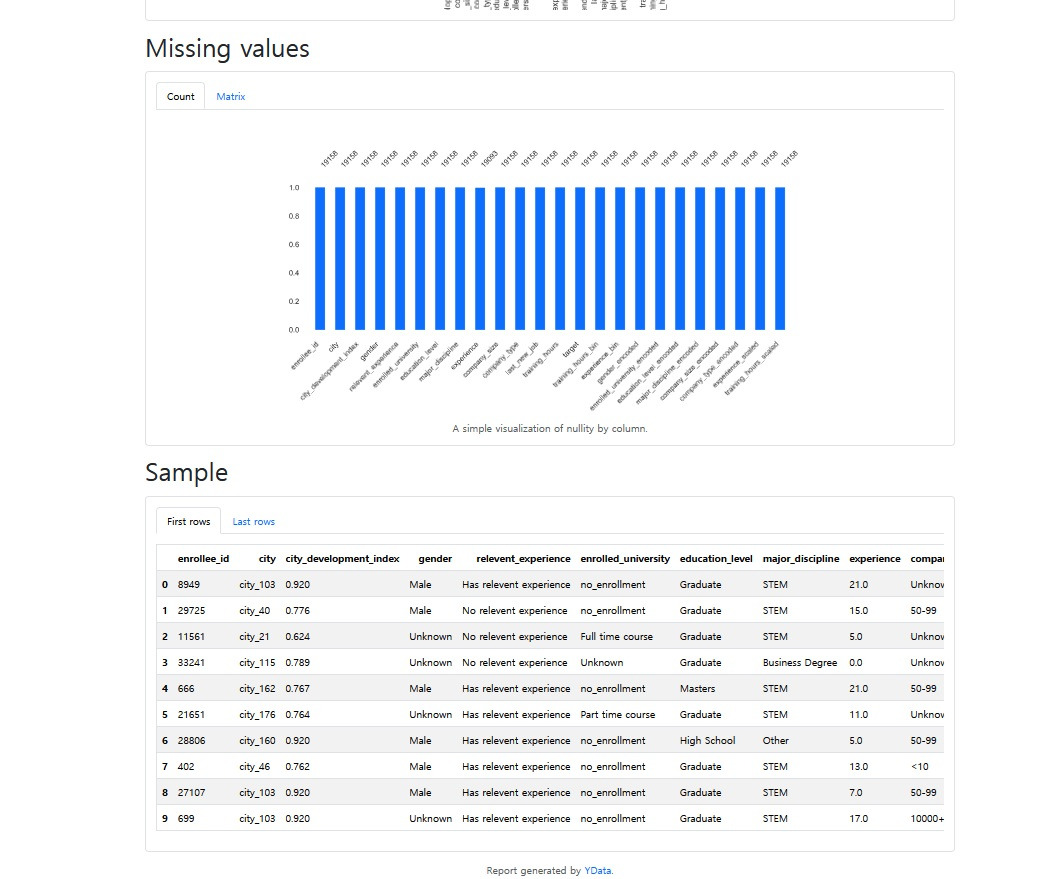 이번에는 Kaggle에서 데이터를 다운로드 받아 EDA를 실시하는 과정을 진행해보겠습니다. 사용한 데이터셋은 Kaggle의 HR Analytics: Job Change of Data Scientists입니다. 이 데이터셋은 데이터 과학자들이 현재 직장을 떠나 새로운 직업을 찾는 경향을 분석할 수 있도록 구성되어 있습니다. 후보자의 고유 ID, 도시 코드, 도시 개발 지수, 성별, 관련 경험, 등록한 대학 과정 유형, 교육 수준, 전공, 총 경력 연수, 현재 회사의 직원 수, 회사 유형, 이전 직장과 현재 직장 사이의 기간, 완료한 교육 시간 등의 정보를 포함하고 있어, 후보자가 직업을 변경하려는 의도를 예측하고, 어떤 요인들이 이러한 결정에 영향을 미치는지 분석할 수 있습니다.