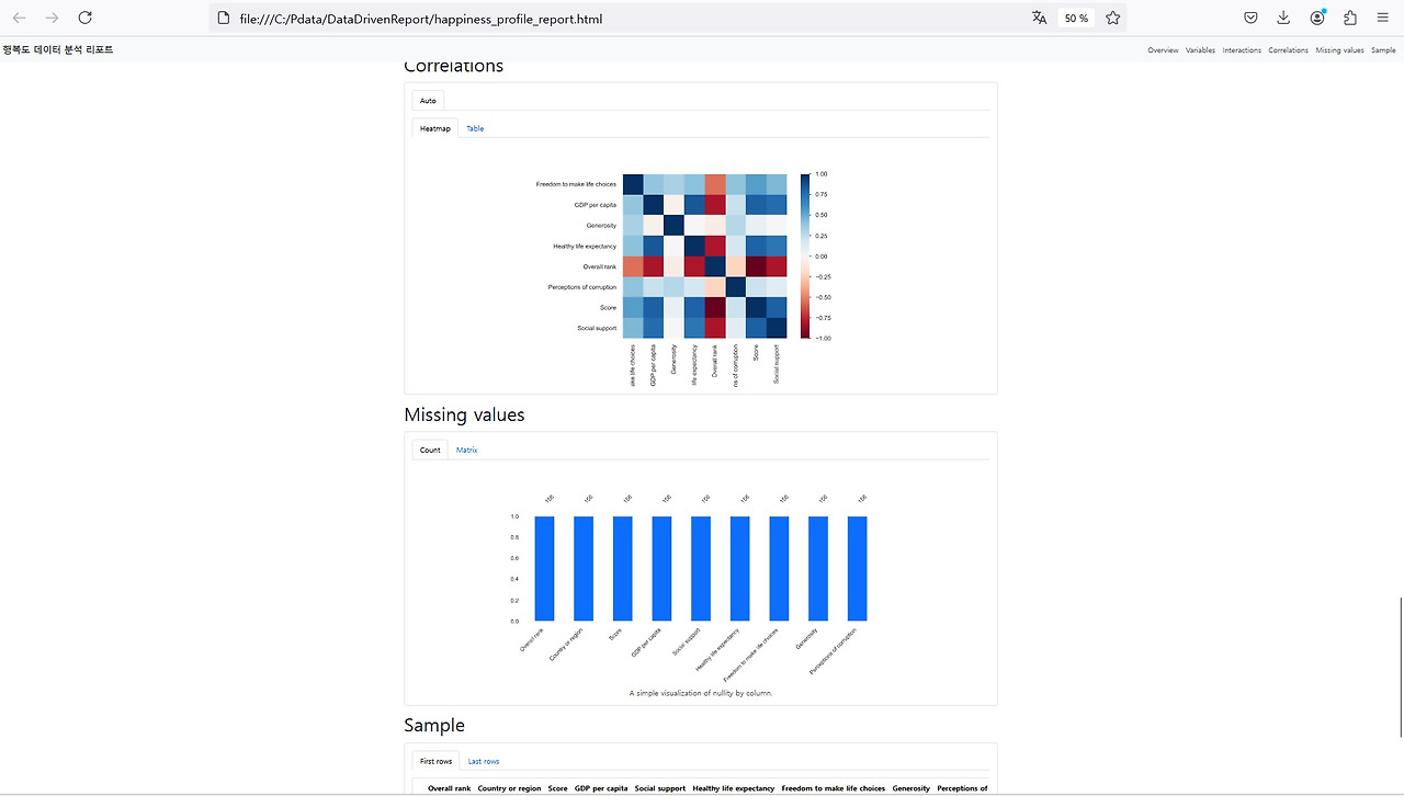 코드를 살펴보면 알 수 있지만, 자동화 EDA 분석 내용은 Happiness_profile_report.html 파일로 저장됩니다. 이 파일은 Cursor AI를 실행할 때 설정한 폴더 내에 저장되어 있습니다. 해당 파일을 클릭하고 마우스 오른버튼 눌러 연결하기 메뉴를 선택후 웹브라우저 프로그램을 선택하면 웹브라우저로 EDA(Exploratory Data Analysis) 분석 리포트를 볼 수 있습니다. 또한 Cursor AI의 Output 화면에서 직접 보고 싶다고 요청하면, EDA 분석 결과 리포트를 바로 확인할 수 있으며, 화면 내 메뉴를 클릭하여 각 분석 결과를 상세히 살펴볼 수 있습니다.