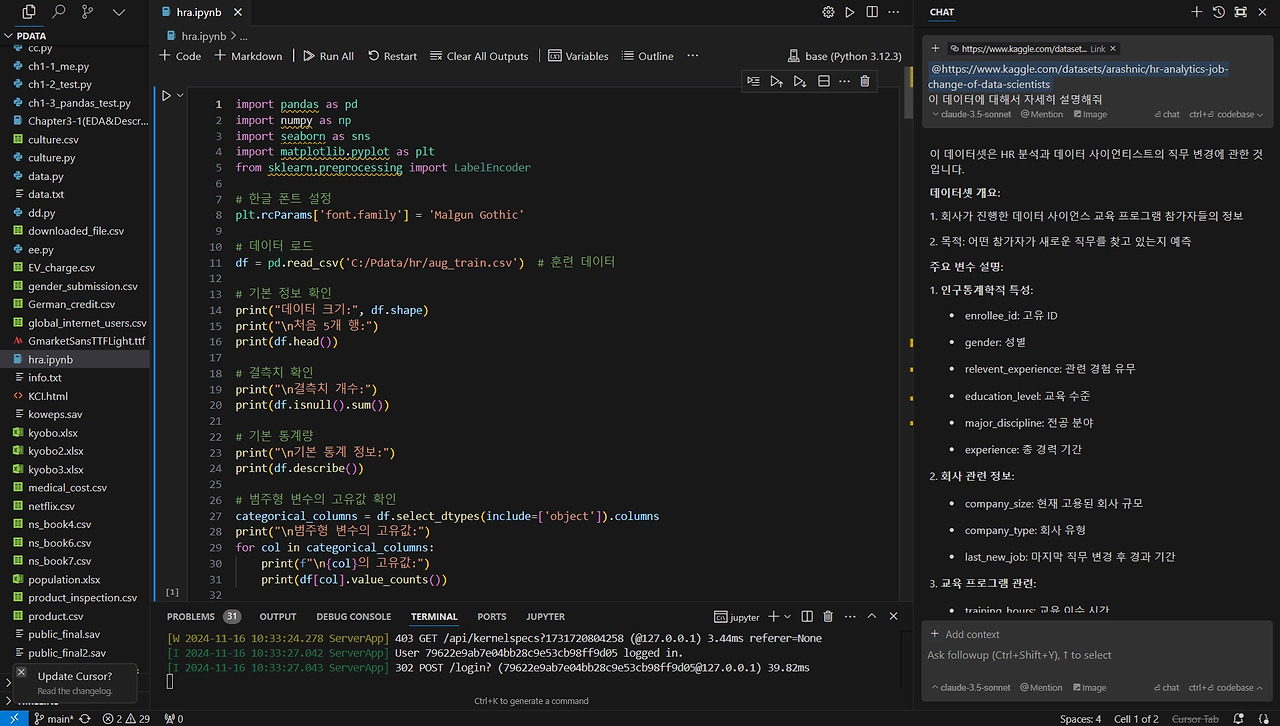 Cursor AI는 홈페이지 내용을 바탕으로 이 데이터를 통해 할 수 있는 분석 내용들을 설명해주었고, 실제로 분석을 진행할 것인지 묻습니다. 분석을 진행하겠다고 답하면 본격적인 분석이 시작됩니다. 데이터셋은 총 3개로 구성되어 있는데, 우리는 로지스틱 회귀분석을 위해 '퇴직 여부' 변수가 포함된 aug_train.csv 파일을 사용합니다.