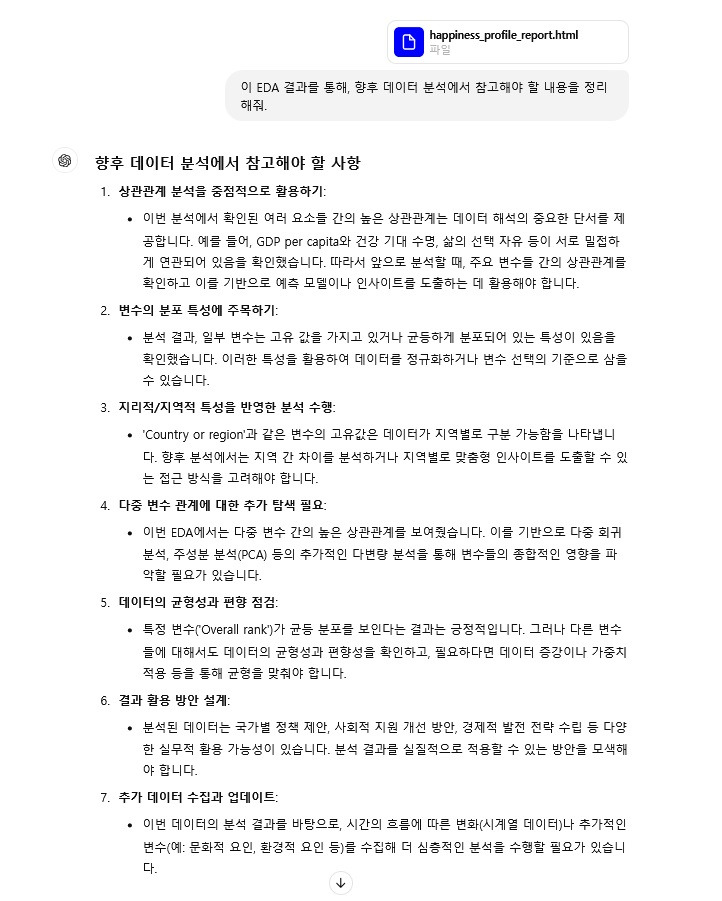 이렇게 생성된 HTML 분석 리포트를 Cursor AI 또는 ChatGPT에 업로드하고, 향후 데이터 분석에 참고해야 할 내용을 문의하면, 데이터 분석 시 고려해야 할 사항들을 항목별로 안내해줍니다.