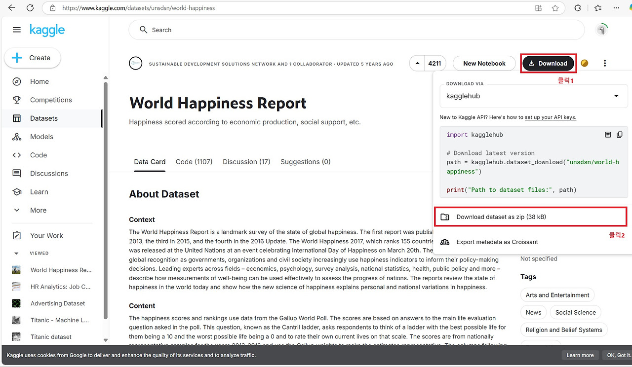 분석에 사용된 데이터는 World Happiness Report입니다. 해당 웹사이트에서 데이터를 다운로드한 후, 압축을 풀면 2015년부터 2019년까지의 연도별 파일이 있습니다. 우리는 2019년 데이터를 사용하여 분석을 진행합니다.