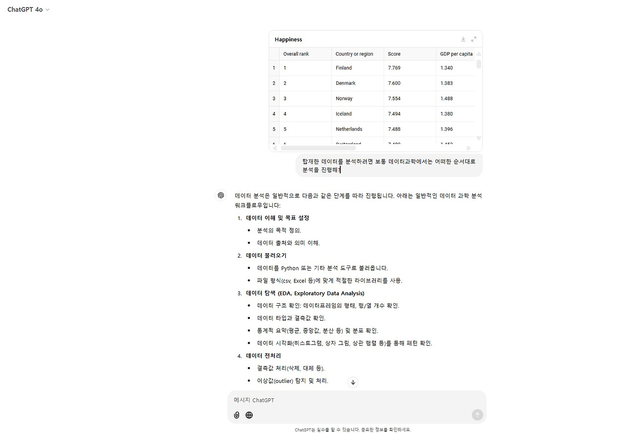 본격적인 분석에 앞서 ChatGPT에 데이터를 업로드하고, 데이터 분석의 순서를 문의해보았습니다. 일반적인 데이터 분석 절차에 대해 안내를 받았습니다.