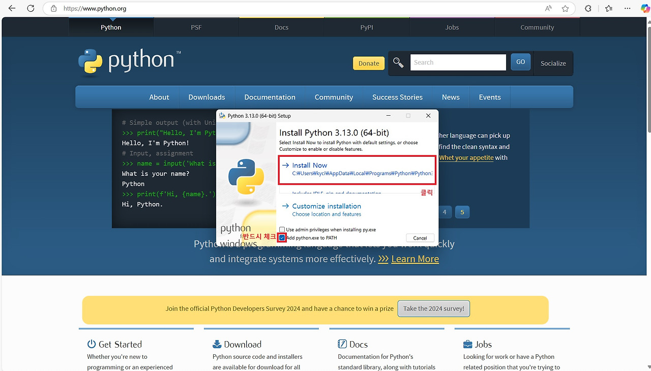 Python 홈페이지 상단의 Downloads 메뉴에 마우스를 올리면 세부 메뉴가 나타납니다. 그중 Python x.xx.x 버튼을 클릭하여 Python 설치 파일을 다운로드합니다. 다운로드 받은 설치 프로그램을 실행하여, Python을 설치합니다. 설치할때에는 아래 그림과 같이 'Add python.exe to PATH' 체크 박스는 반드시 체크한 후 설치를 진행합니다.