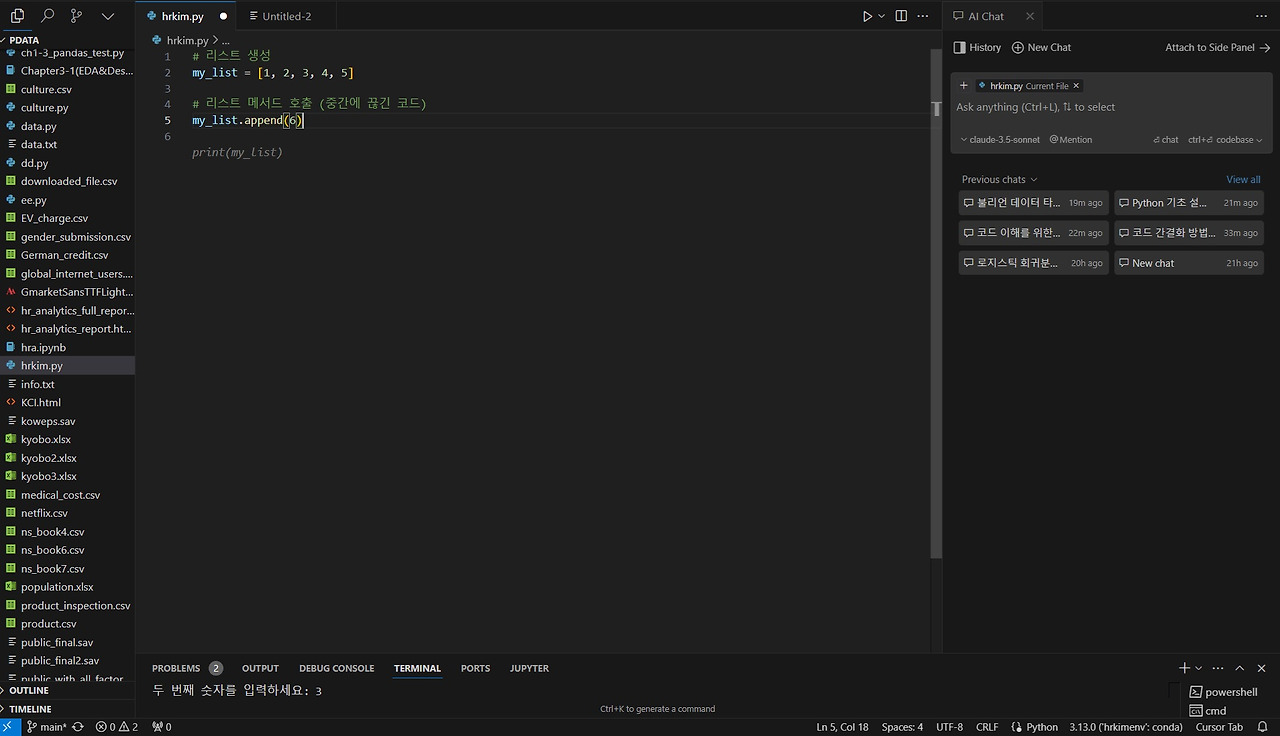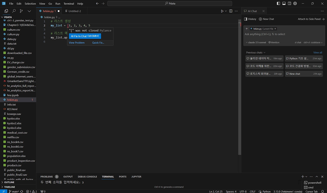 Cursor AI에서는 코드 작성 시 발생하는 문법적 오류나 개선사항을 색상별 밑줄로 표시해줍니다. 빨간색 밑줄은 코드 실행을 방해하는 심각한 문법 오류를, 노란색 밑줄은 코드가 실행은 되지만 개선이 필요한 경고사항을 나타냅니다. 아래 화면에서는 my_list = [1, 2, 3, 4, 5] 라인에서 대괄호가 닫히지 않은 문법 오류가 발생했으며, Cursor AI는 이를 빨간색으로 표시하고 이에 대한 해결 옵션을 제공하여 사용자가 쉽게 디버깅을 할 수 있도록 도와줍니다.