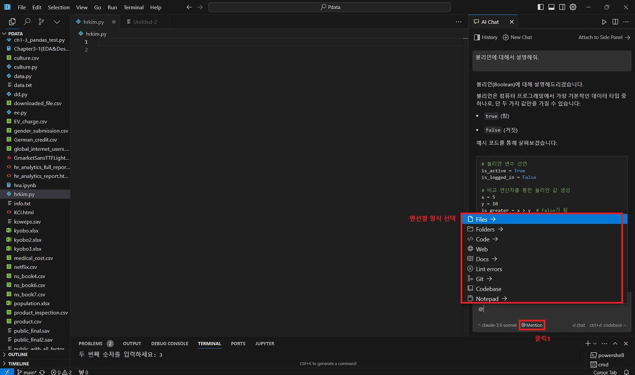 @파일명으로 로컬 파일의 내용을, @웹주소로 웹 페이지의 내용을 불러올 수 있습니다. 뿐만 아니라 코드 스니펫, 문서 내용, 이미지 및 미디어 파일, 로그 파일, 데이터 조각 등 다양한 유형의 콘텐츠도 멘션하여 활용할 수 있습니다.