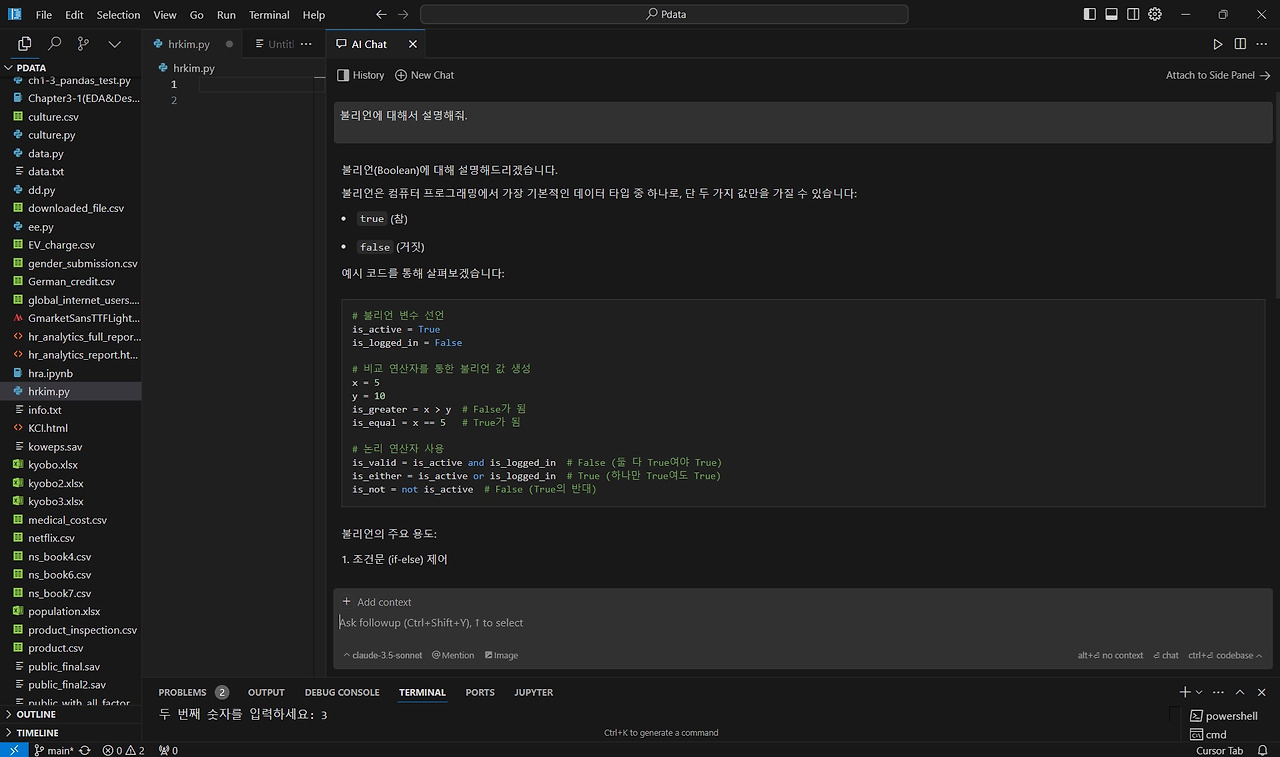 Cursor AI는 코드에 대한 학습 외에도 ChatGPT, Claude 등과 대화를 통해 일반적인 답을 얻는 기능으로도 활용할 수 있습니다. 아래 화면은 불리언에 대해 채팅에 질문하여 답변을 얻는 모습입니다. 또한 채팅에는 ChatGPT, Claude 등 실제 외부 생성형 AI 모델과 연결되어 작동되며, 선호나 목적에 따라 생성형 AI 모델을 변경할 수도 있습니다.