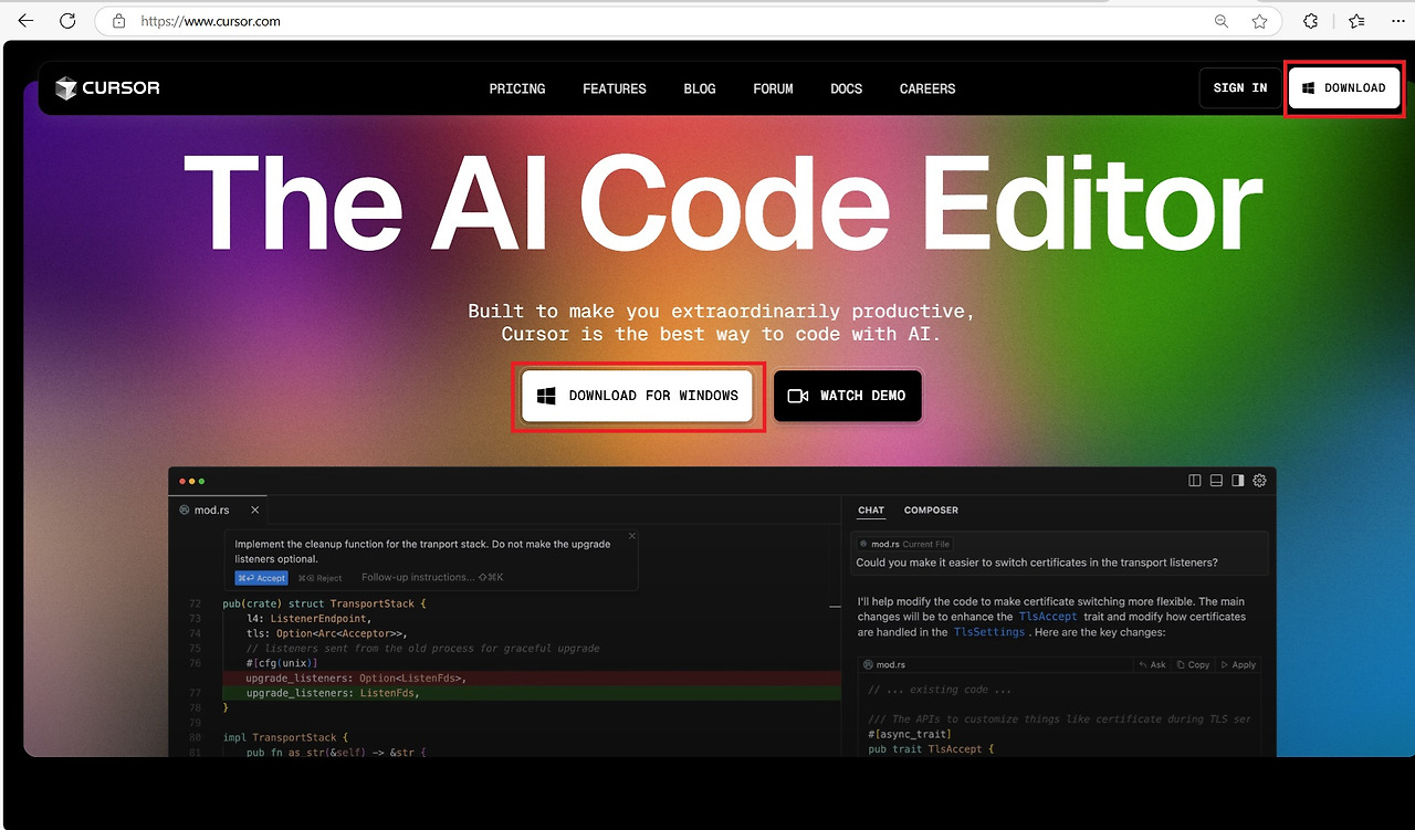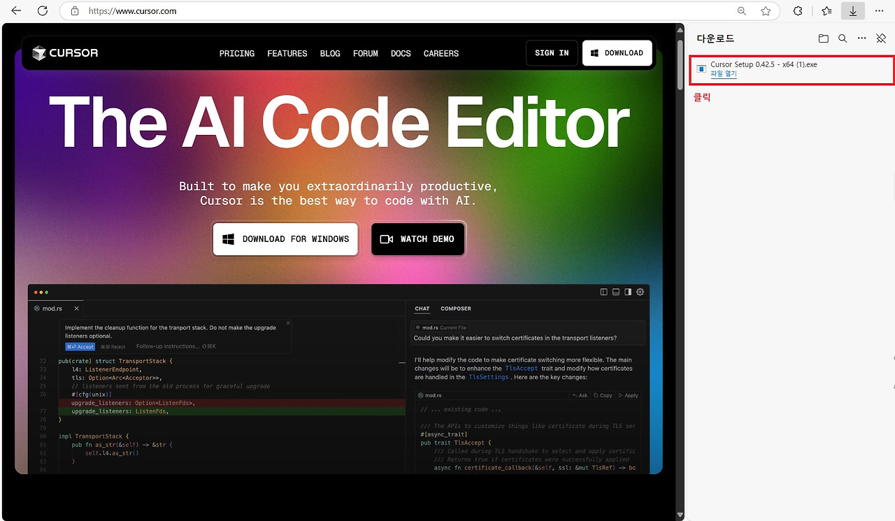 Cursor AI 홈페이지에 접속후 [Download] 버튼을 클릭합니다. 본인 OS에 맞는 Cursor AI 버전을 맞춤형으로 다운로드받을 수 있게 해줍니다.