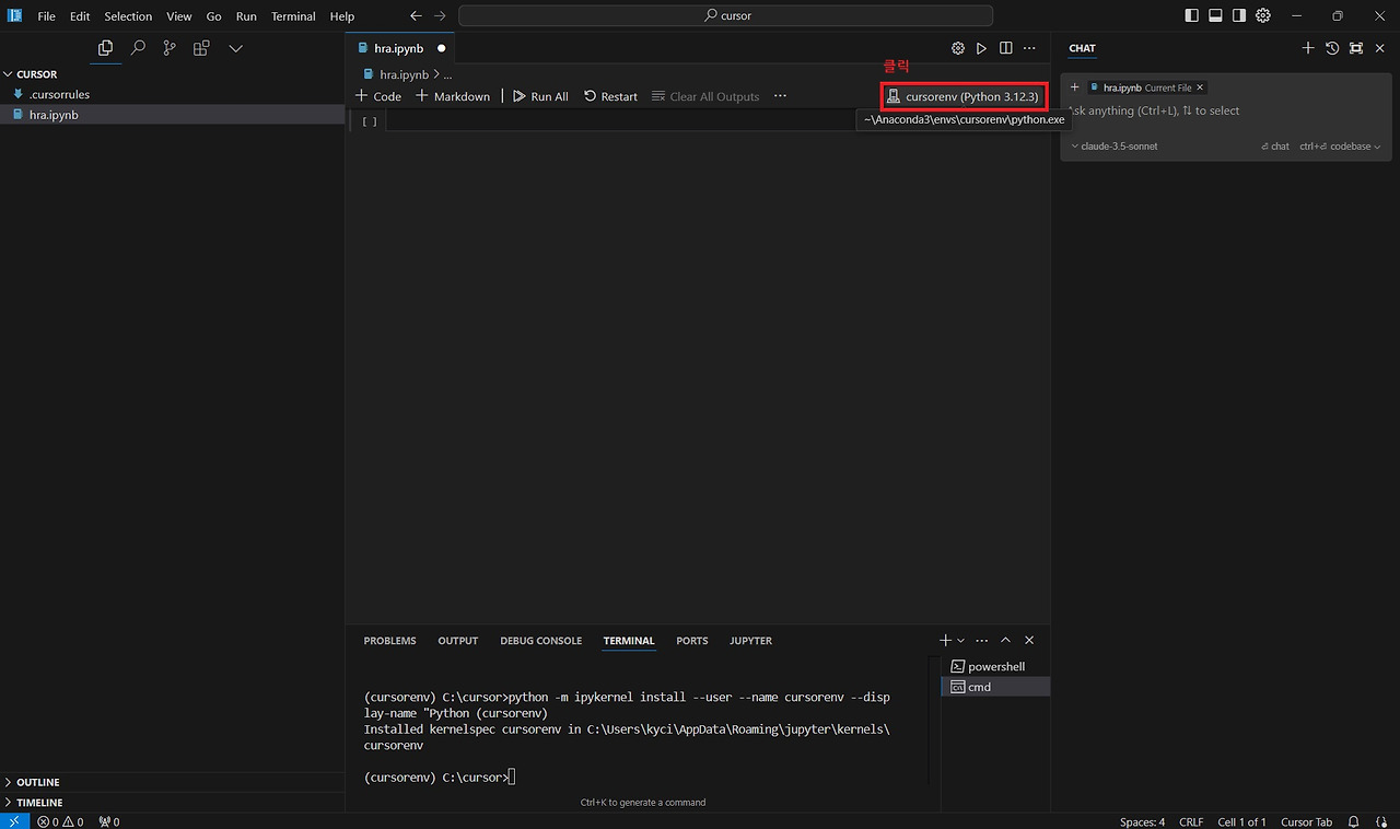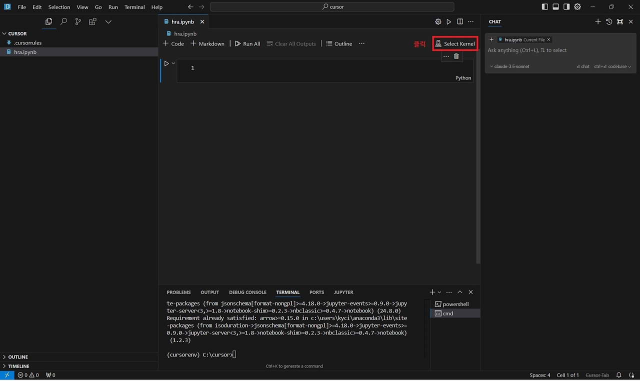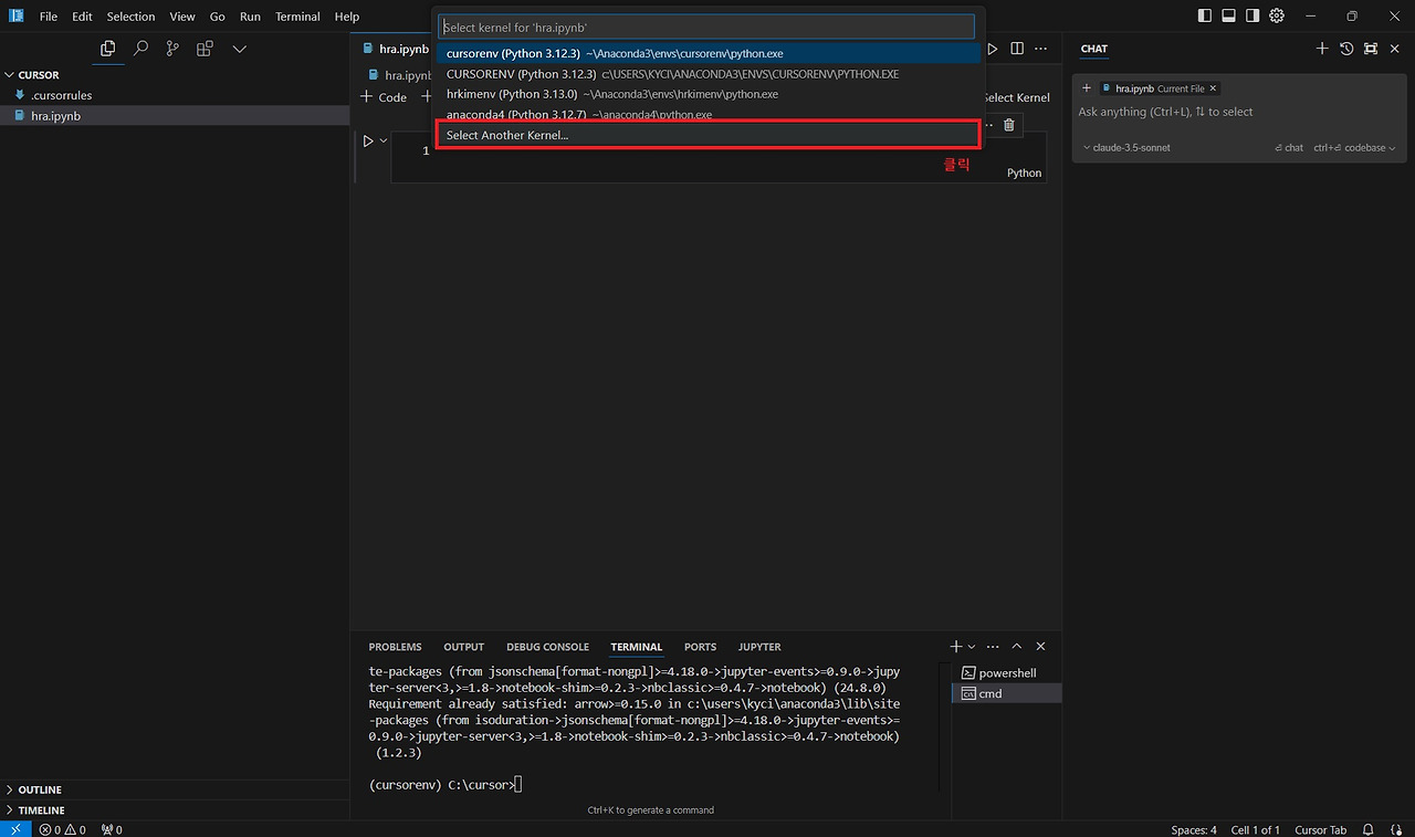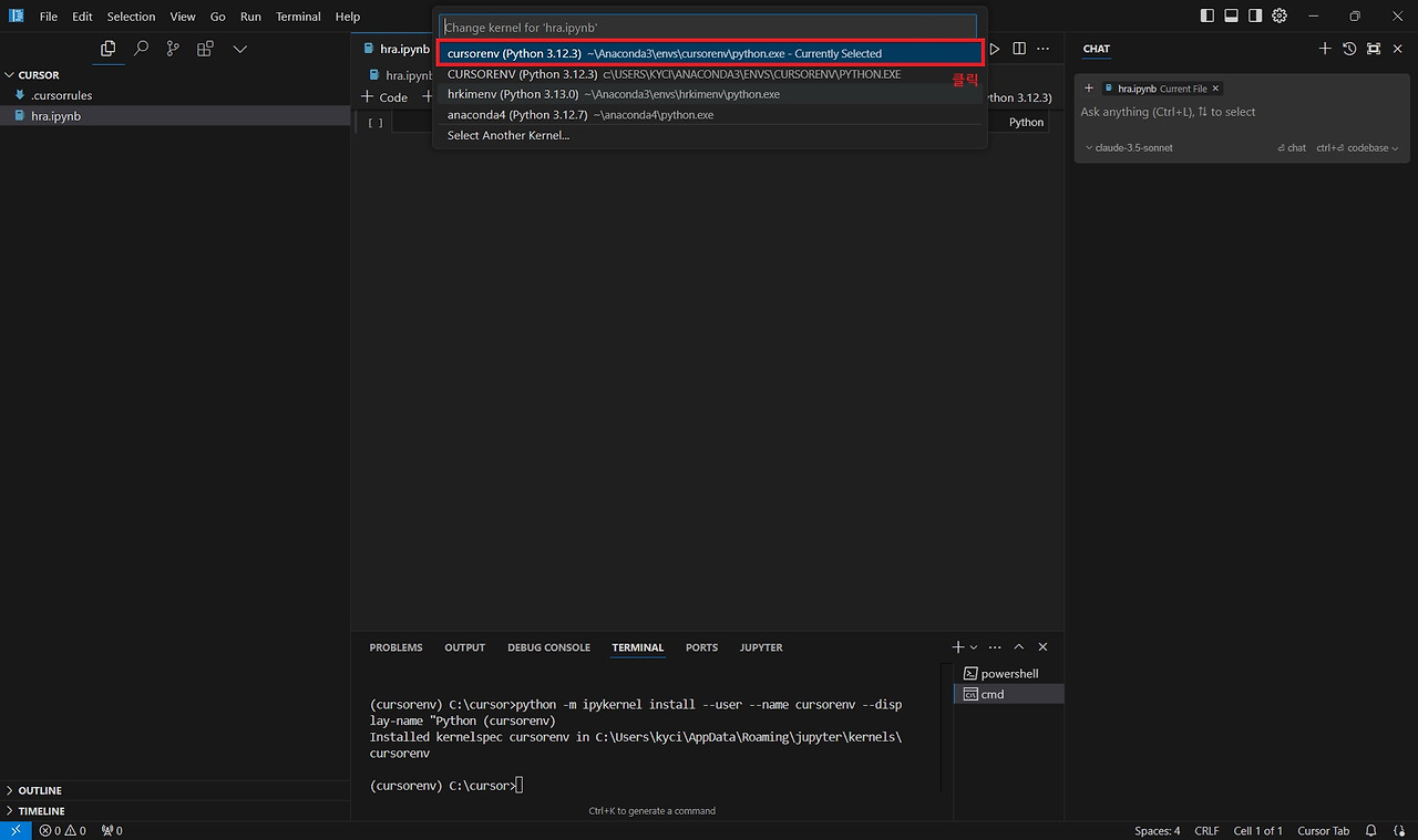 파일을 xxxx.ipynb 형태로 저장하면 주피터 노트북 작업 환경이 활성화됩니다. 하지만 이를 제대로 활용하려면 프로젝트에 맞는 적절한 커널을 선택해야 합니다. 커널(Kernel)은 주피터 노트북에서 코드를 실행하는 백엔드 엔진으로, Python 코드 실행을 담당합니다. 특히 각 프로젝트마다 다른 가상환경을 사용하는 경우, 해당 환경에 맞는 커널을 선택하는 것이 중요합니다. 우측 상단의 [Select Kernel]을 클릭하면 Cursor AI 상단에서 가상환경을 선택할 수 있습니다. 이제 가상환경을 커널에 연결하는 방법에 대해 설명하겠습니다.