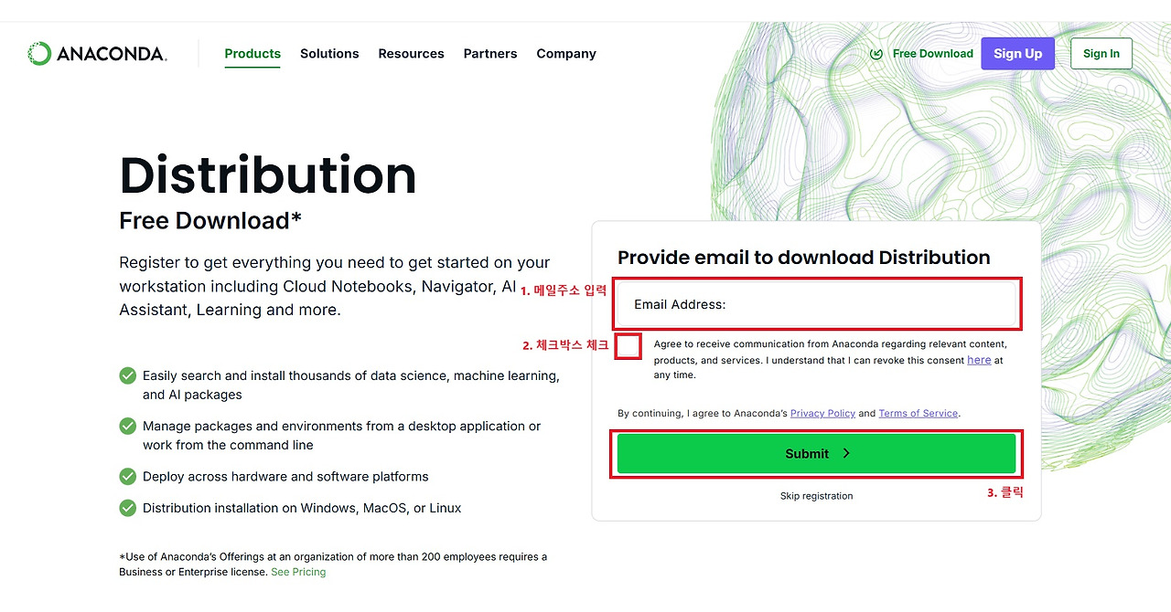 첫 번째로, 제공된 입력란에 본인의 이메일 주소를 입력합니다. 두 번째로, "아나콘다에서 제공하는 관련 콘텐츠, 제품 및 서비스에 대한 커뮤니케이션을 받는 데 동의합니다"라는 문구가 있는 체크박스를 클릭해 동의합니다. 마지막으로, 입력한 정보와 동의 사항을 확인한 후 Submit 버튼을 클릭하면 등록이 완료됩니다.
