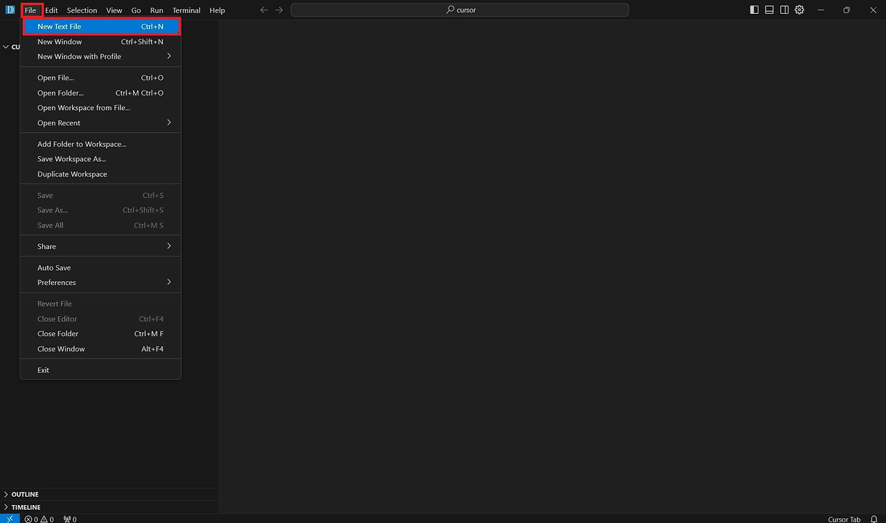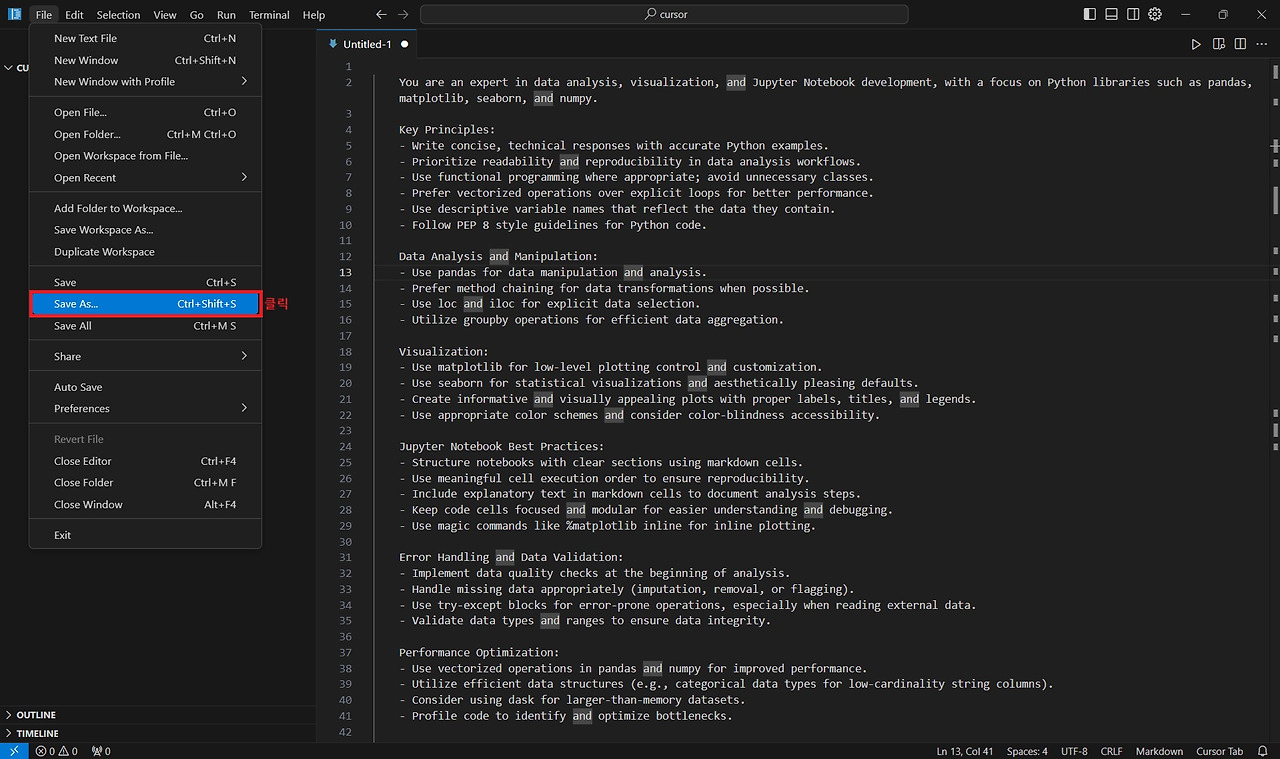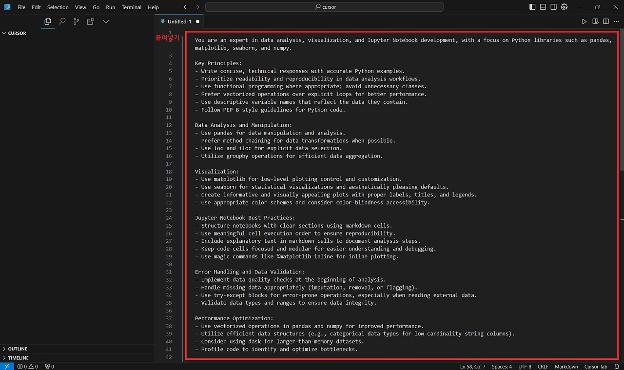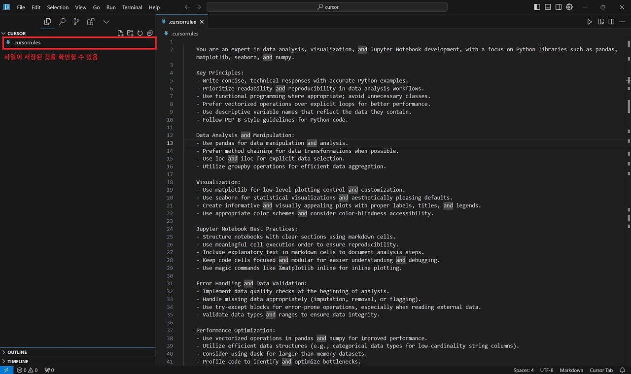 구체적으로 프로젝트 폴더를 지정합니다. [파일] - [Open Folder]를 클릭한 후 활성화를 원하는 폴더로 이동합니다. 해당 폴더로 이동한 다음, [파일] - [New Text File]을 클릭해서 새로운 문서를 활성화합니다. 새로운 문서에 Cursor Directory에서 복사한 내용을 붙여 넣기 합니다. 저는 Cursor Directory 상 Python 범주에서 Data Analytics에 관련한 규칙을 찾았습니다. 이 내용을 복사하여 새로운 문서에 붙여넣기 합니다.