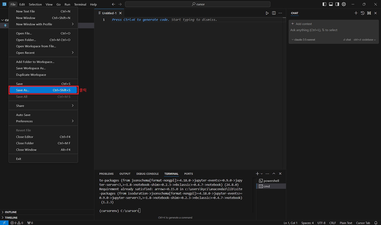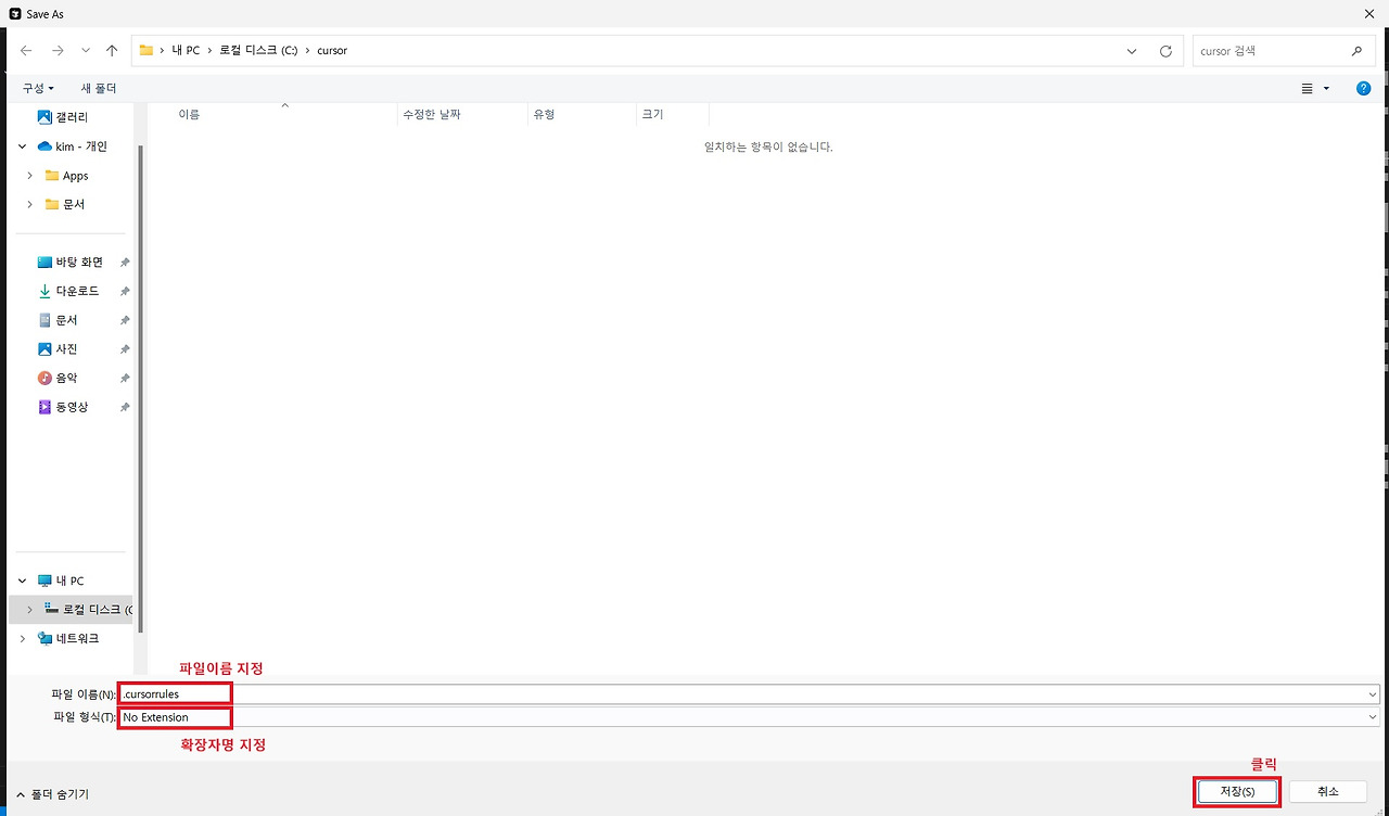 붙여넣기 한 다음에는 [File] - [Save as]를 클릭하여 파일을 저장합니다. 파일을 저장할 때에는 파일명은 '.Cursorrules'로 해야하며, 확장자명은 No Extension으로 설정합니다. 이렇게 파일을 저장하면 왼쪽 폴더 화면에 Cursorrules 파일이 저장되는 것을 확인할 수 있습니다.