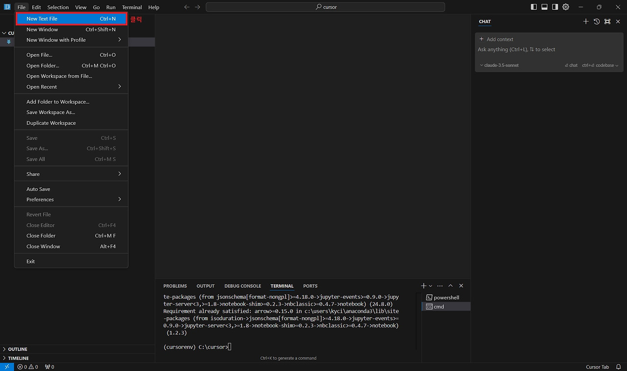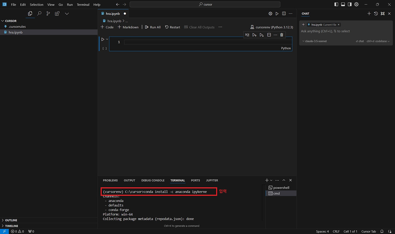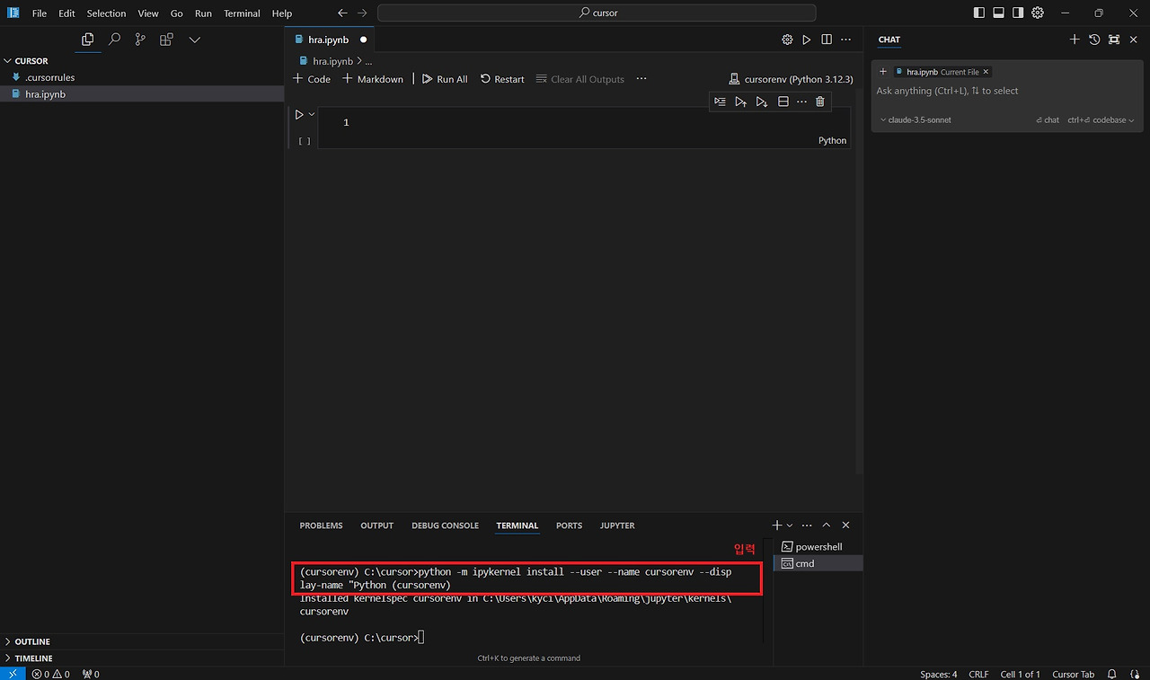 활성화가 성공하면 터미널에 (myenv)와 같은 형식으로 환경 이름이 표시됩니다. 제 경우에는 가상환경 이름을 cursorenv로 설정하였으며, (cursorenv) 환경이 활성화된 것을 볼 수 있습니다. 가상환경을 활성화한 후, 주피터 노트북에서 사용할 수 있도록 ipykernel 패키지를 설치해야 합니다. 이를 위해 다음 명령어를 실행합니다.