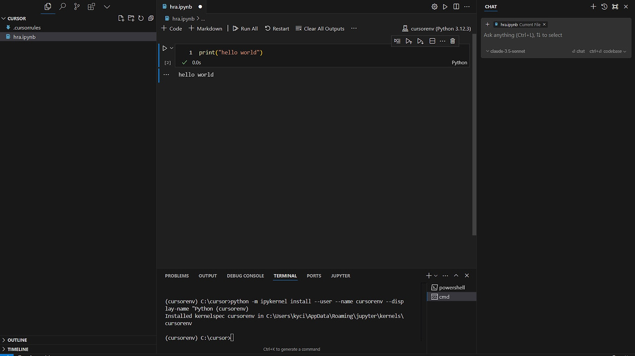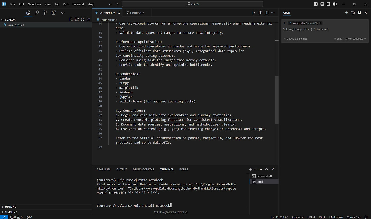 마지막으로, Cursor AI에 주피터 노트북을 연결하면 데이터 분석과 머신러닝 작업에 매우 유용합니다. 원래 주피터 노트북은 웹 상에서 별도로 구현되는 프로그램이지만, Cursor AI에 연결하면 더욱 통합적으로 활용할 수 있습니다. 주피터 노트북은 코드의 일부를 실행하고 그 결과를 바로 확인할 수 있어 데이터 탐색 및 분석에 큰 이점을 제공합니다. 이번 글에서는 웹과의 연결이 아닌, Python 가상환경과 연동하여 주피터 노트북을 사용하는 방법에 초점을 맞추겠습니다. 이를 통해 독립적인 분석 환경을 구축하고, 효율적인 작업 흐름을 경험할 수 있습니다.