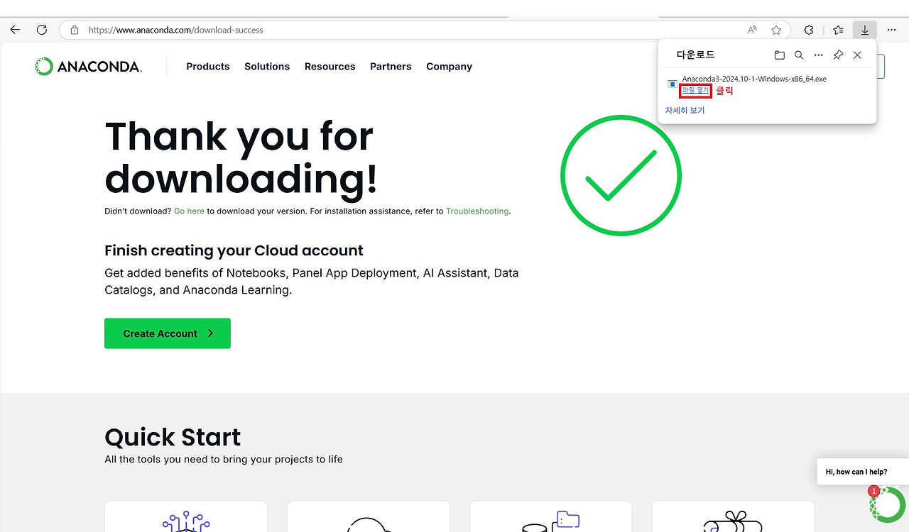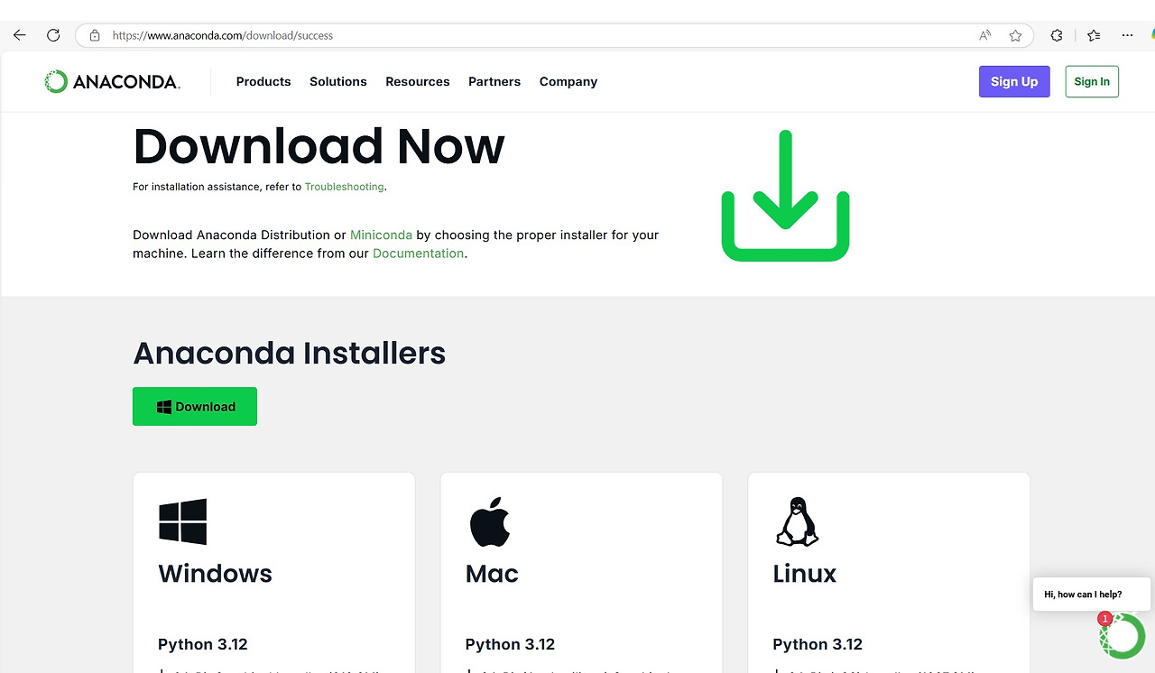 등록이 완료되면 아래 화면과 같이 사용 중인 운영 체제에 맞는 아나콘다 다운로드 링크가 제공됩니다. Windows, macOS, 또는 Linux 중 하나를 선택해 설치 파일을 다운로드합니다.
