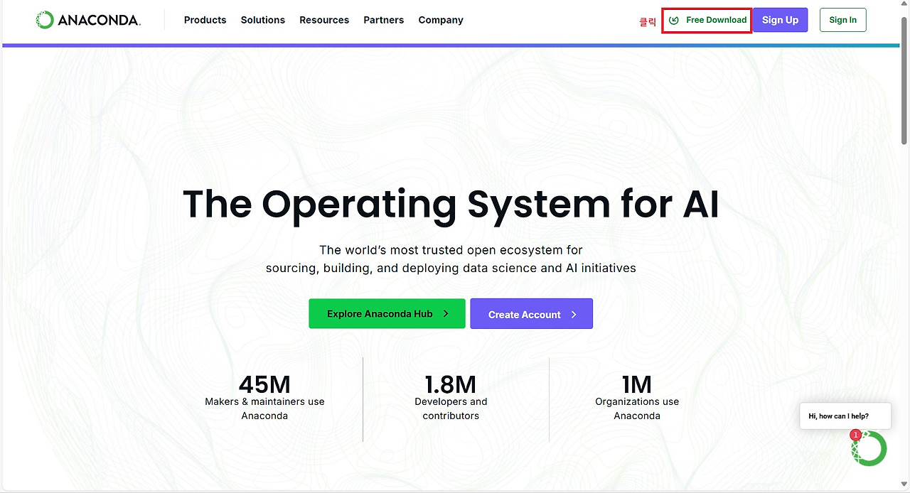 아나콘다(Anaconda)는 간단한 절차를 통해 무료로 다운로드할 수 있습니다. 먼저, 브라우저를 열고 아래 아나콘다 공식사이트에 접속한 뒤, 화면 상단의 Free Download 버튼을 클릭합니다. 이후 나타나는 다운로드 페이지에서 몇 가지 간단한 등록 절차를 진행하면 됩니다.