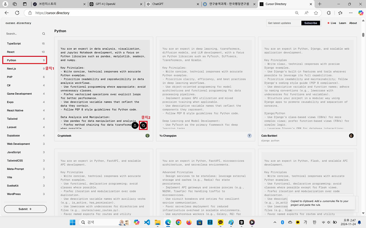아래 Cursor Directory에 있는 다양한 규칙 템플릿 중에서 자신에게 맞는 것을 찾아 복사합니다. 그런 다음 현재 Python 코딩을 진행하고 있는 프로젝트 폴더(현재 작업하고 있는 xxxx.py 또는 xxxx.ipynb 파일이 있는 폴더) 안에 .cursorrrules 파일을 생성하고, 복사한 규칙을 붙여 넣으면 됩니다.