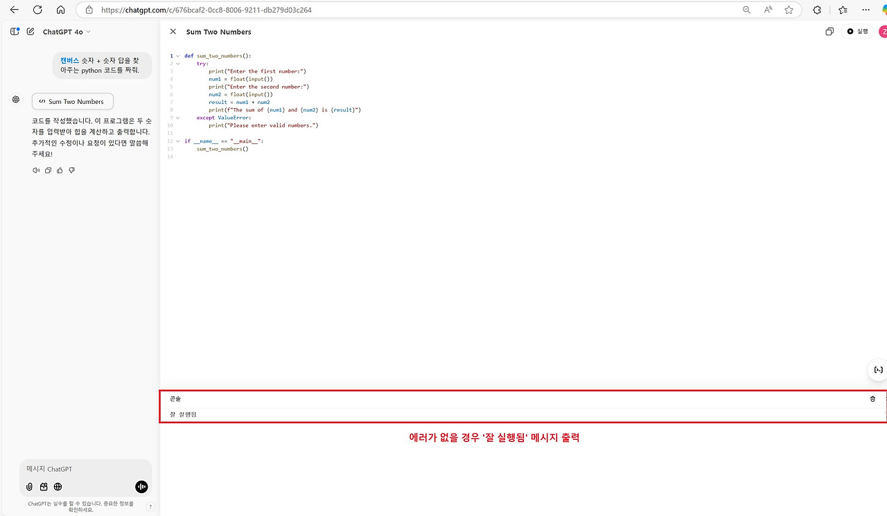 코드에 에러가 발생하면 하단에 에러 메시지가 표시되고, 해당 메시지를 클릭하면 좌측 상단에 “[버그 수정]” 팝업창이 활성화됩니다. 이 버튼을 클릭하면 에러가 난 부분을 분석해 코드를 자동으로 수정해주고, 이런 작업을 반복해 최종 실행 화면이 뜨면 코드가 완성된 것입니다.