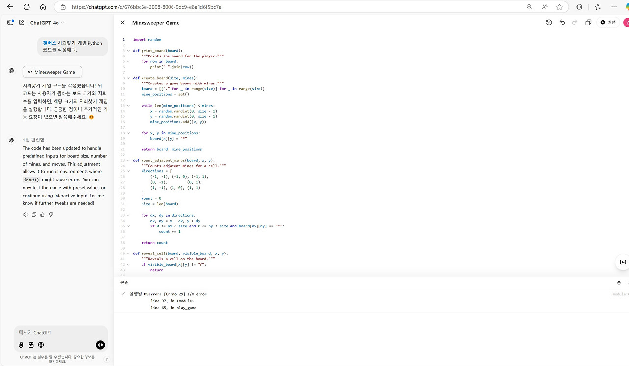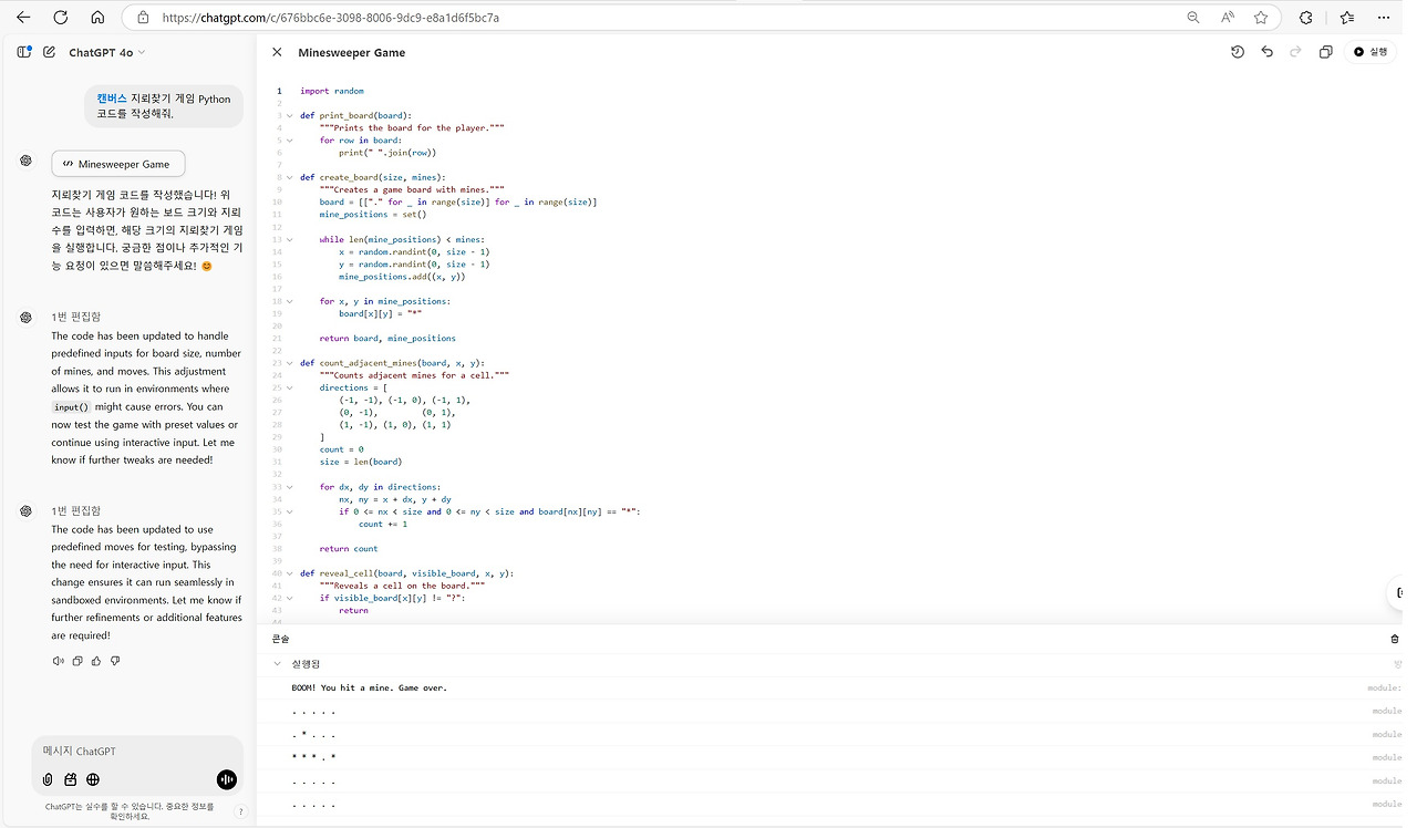 코딩 작업에서도 이 캔버스 모드는 강력한 도움을 줍니다. 예를 들어 “지뢰찾기 게임 Python 코드를 작성해줘”라고 입력하면, 캔버스에 Python 코드를 자동으로 작성해줍니다. 특정 영역을 지정해 추가 요청을 할 수도 있고, 직접 코드를 수정할 수도 있습니다. 그리고 무엇보다 우측 상단의 [실행] 버튼을 클릭해 ChatGPT 내에서 직접 Python 코드를 실행하고 디버깅할 수 있는 점이 큰 장점입니다.