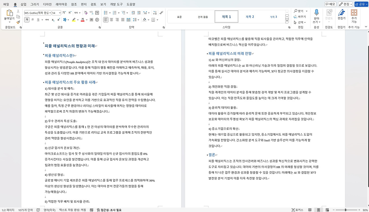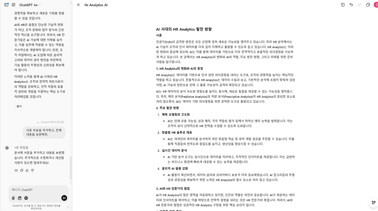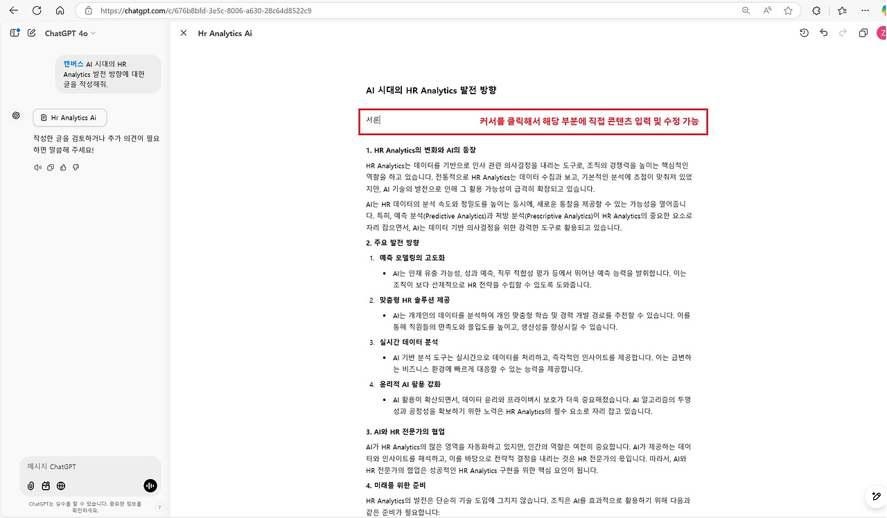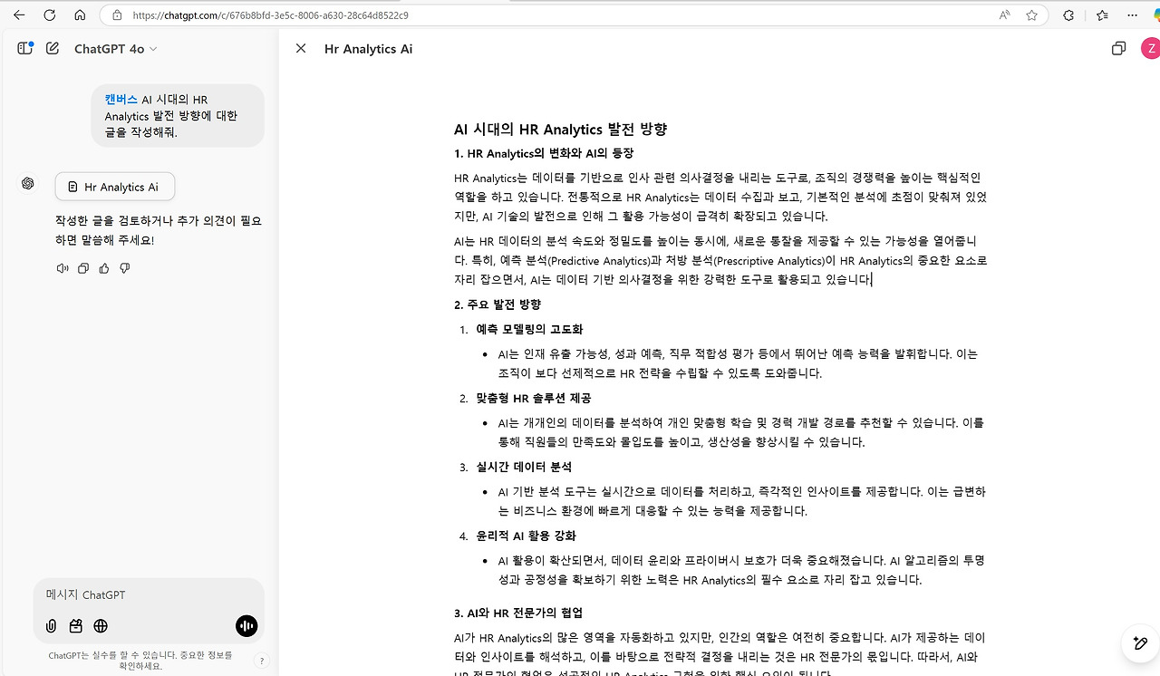 이 상태에서 캔버스 파란 글자 옆에 “AI 시대의 HR Analytics 발전 방향에 대한 글을 작성해줘”라고 입력하면, 오른쪽 큰 캔버스 영역에 자동으로 글이 생성됩니다.