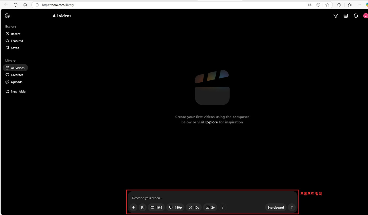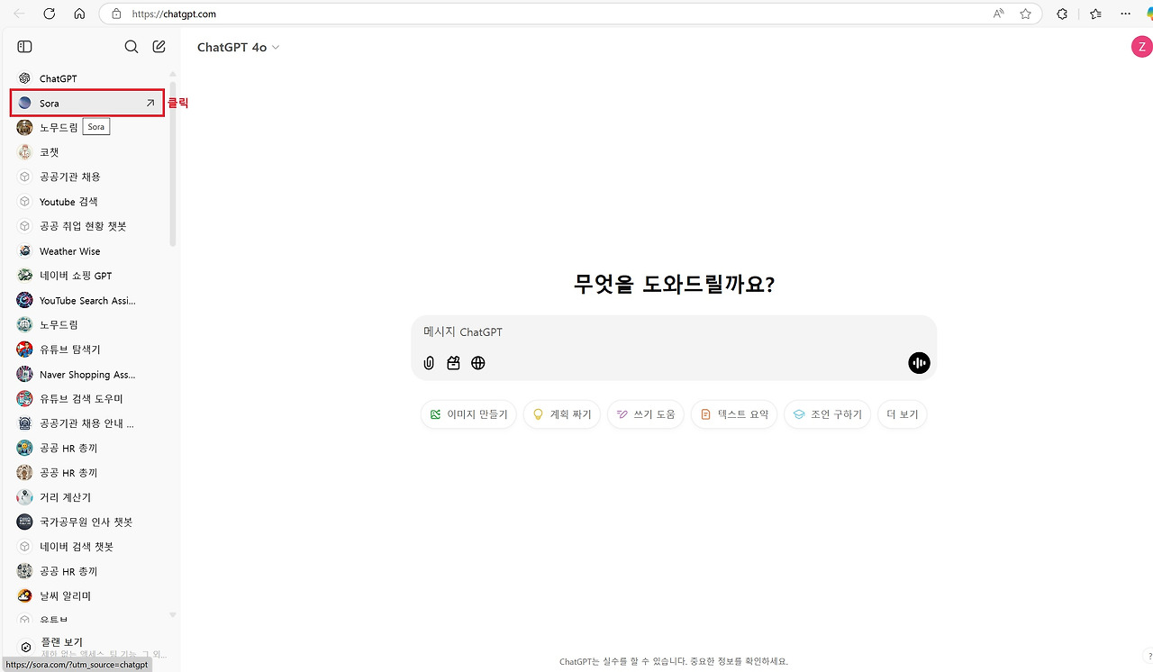 위 URL을 통해 Sora AI에 접속하는 방법도 있지만, ChatGPT 메인화면 좌측 메뉴바의 Sora를 클릭해 접속할 수도 있습니다. 계정 정보를 통해 Sora AI 메인화면으로 바로 이동할 수 있습니다.