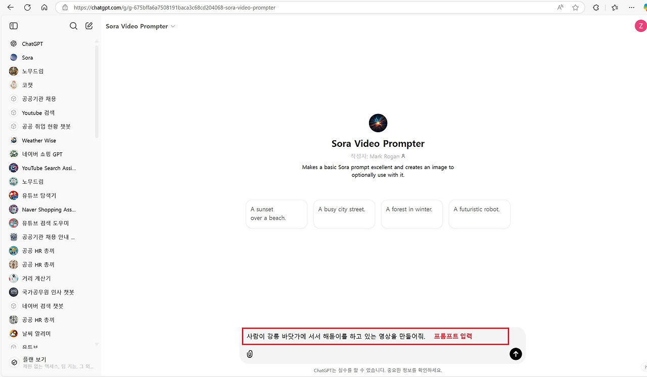 Sora AI를 사용하는 방법은 매우 간단합니다. ChatGPT의 DALL·E 이미지를 생성하듯이, 원하는 동영상 내용을 프롬프트로 입력하면 됩니다. 좀 더 구체적인 프롬프트를 작성하기 위해서는 GPTs 중 “Sora AI 프롬프트 생성 프로그램”을 활용해 보는 것도 좋습니다.