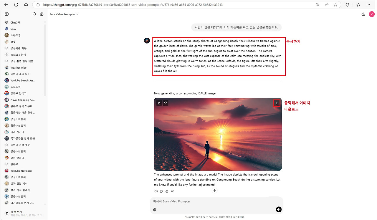 예를 들어, GPTs 메인화면에서 “Sora prompt”로 검색해 “Sora Video Prompter”라는 GPTs를 찾습니다. 여기서 “사람이 강릉 바닷가에 서서 해돋이를 하고 있는 영상을 만들어줘”라고 입력해 프롬프트와 이미지를 제공받았습니다. 제공된 프롬프트는 드래그해서 복사하고, 이미지는 우측 상단 다운로드 버튼을 눌러 저장합니다.