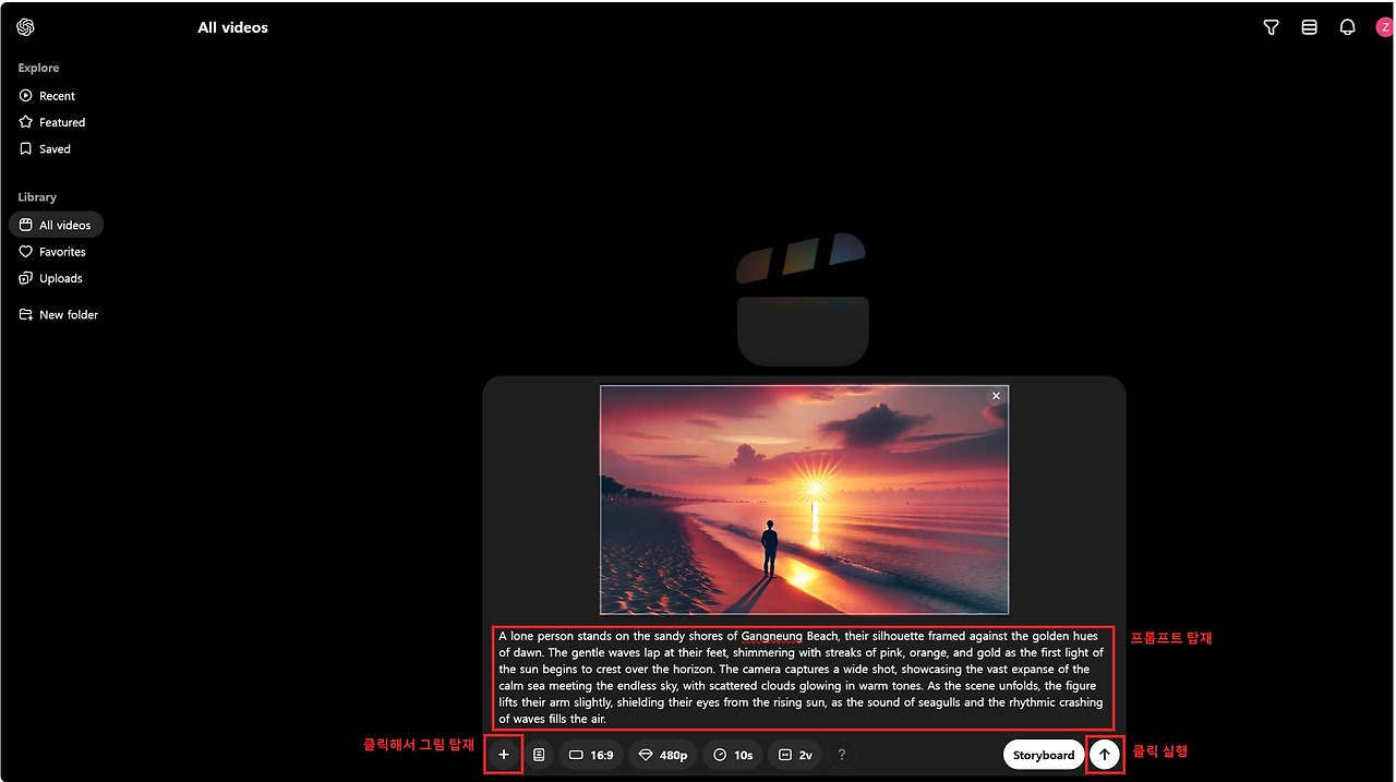 다시 Sora AI 메인화면으로 돌아와 프롬프트 창에 복사한 내용을 붙여 넣고, 좌측 하단의 [+] 버튼으로 다운로드받은 이미지를 탑재합니다. (물론, 이미지가 마음에 들지 않으면 생략해도 됩니다.) 이후 우측 하단의 실행 버튼을 클릭하면, 이미지와 프롬프트를 참고하여 동영상을 생성합니다.