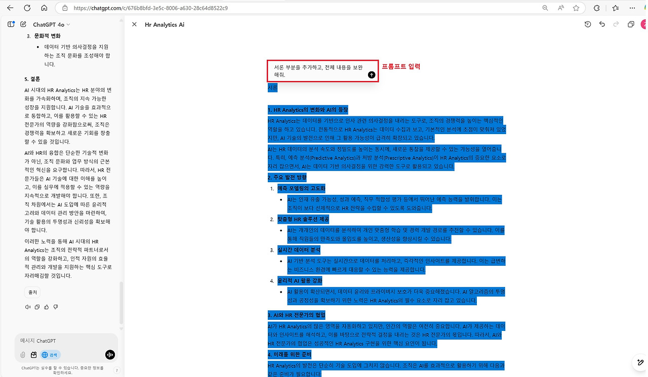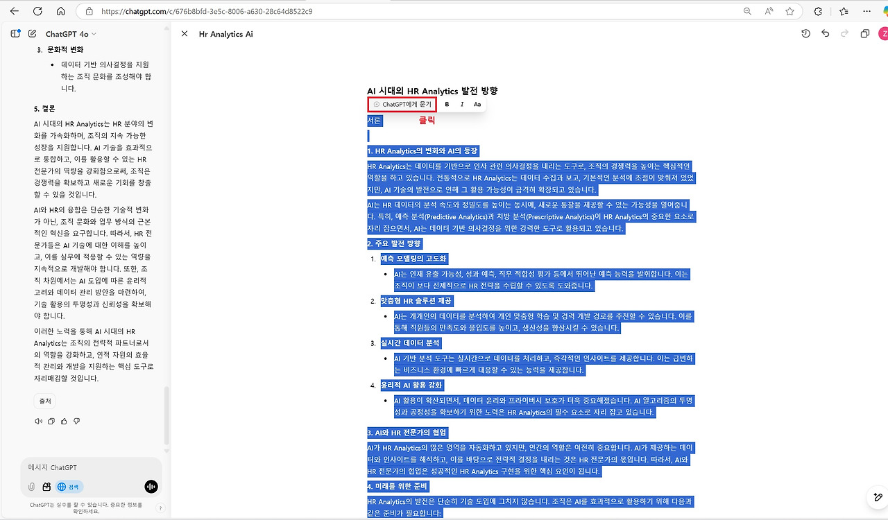 특정 부분을 드래그한 뒤, 좌측 하단에 뜨는 'ChatGPT에게 묻기' 메뉴를 클릭하면 추가 요청을 넣을 수 있습니다. 예를 들어 “서론 부분을 추가하고 전체 내용을 보완해줘”라고 하면, 해당 부분에 서론을 채워주고 전체 내용을 보강해줍니다.