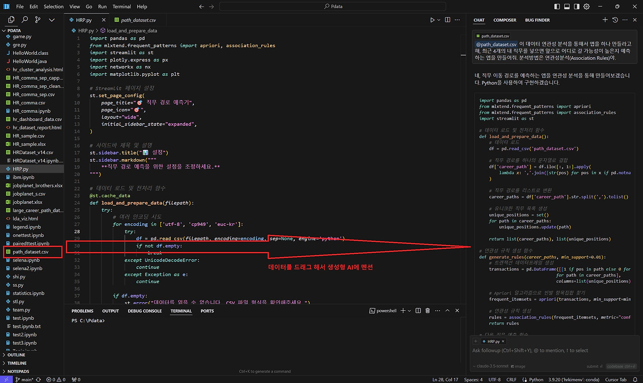 분석을 시작하기 위해 프로젝트 폴더 내에 있는 'path_dataset.csv' 파일을 Cursor AI의 생성형 AI 창으로 드래그하여 파일을 멘션합니다. 파일을 멘션한 후, 다음과 같이 프롬프트를 입력합니다: