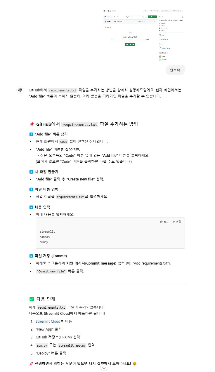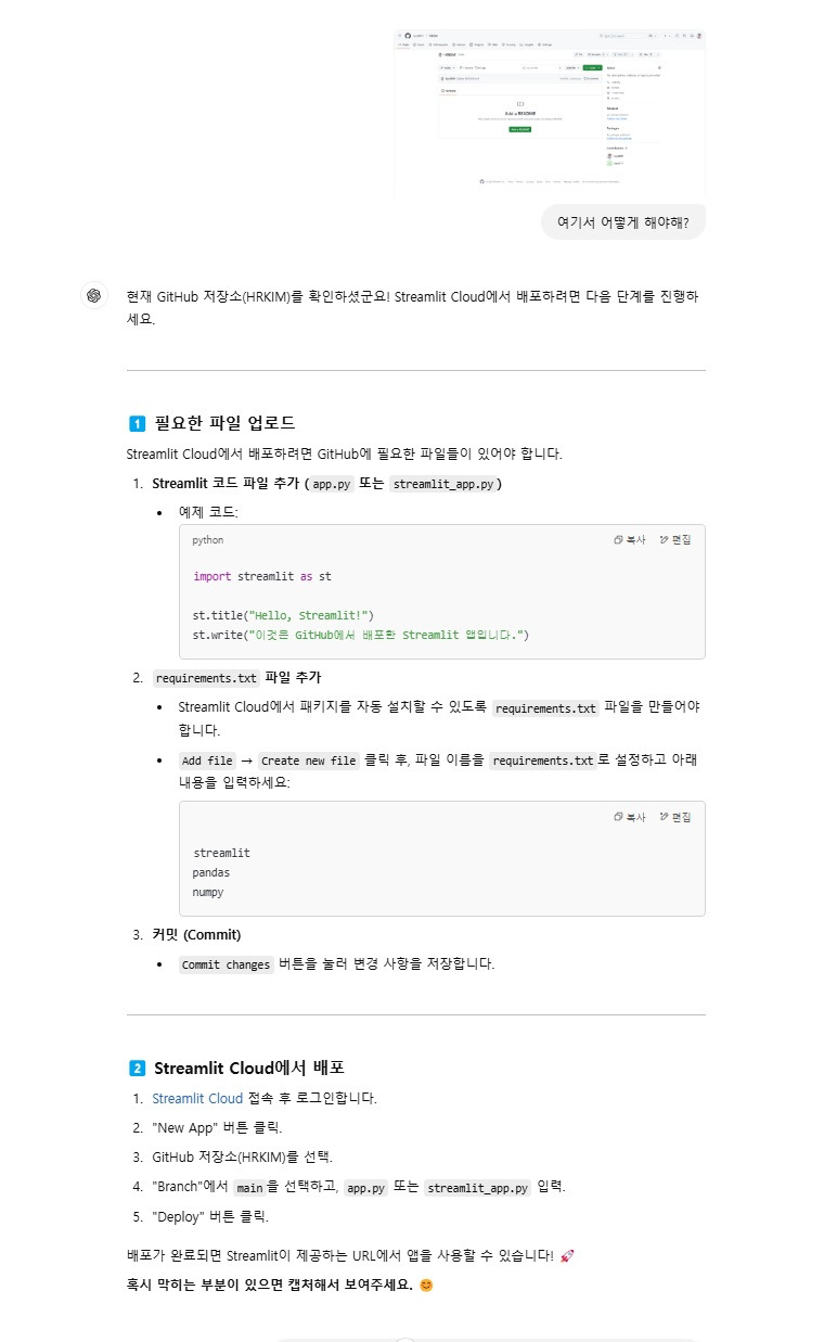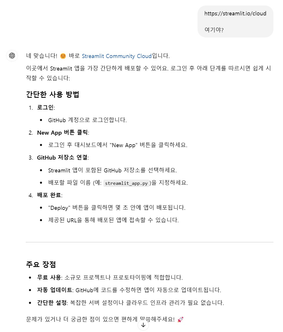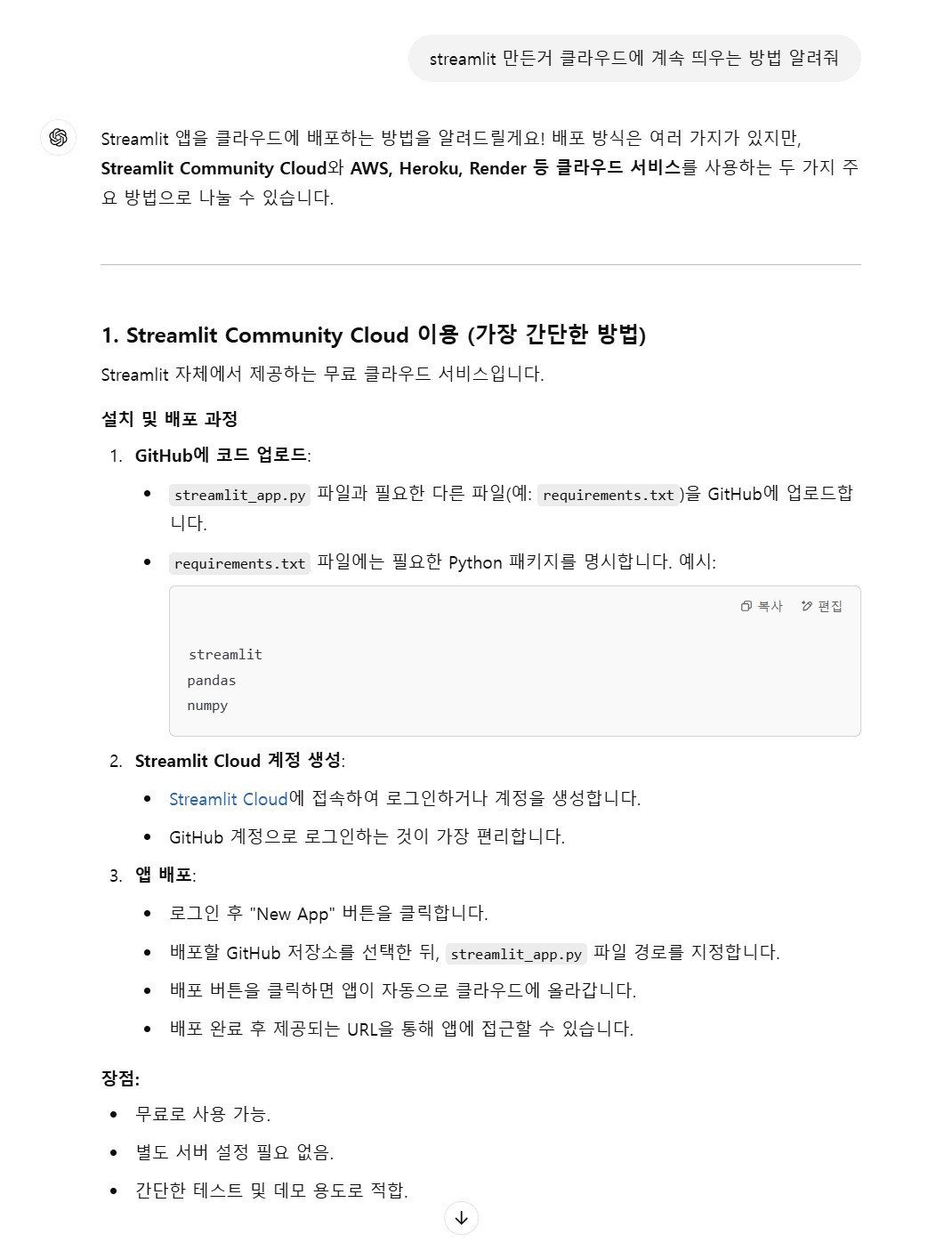 현재 실행 중인 Streamlit 앱은 로컬 PC에서만 사용할 수 있습니다. 이를 웹을 통해 언제 어디서나 접근 가능하도록 하기 위해서는 프로그램을 웹에 배포해야 합니다. 이번 섹션에서는 이 프로그램을 웹상에 배포하는 방법을 살펴보겠습니다.
