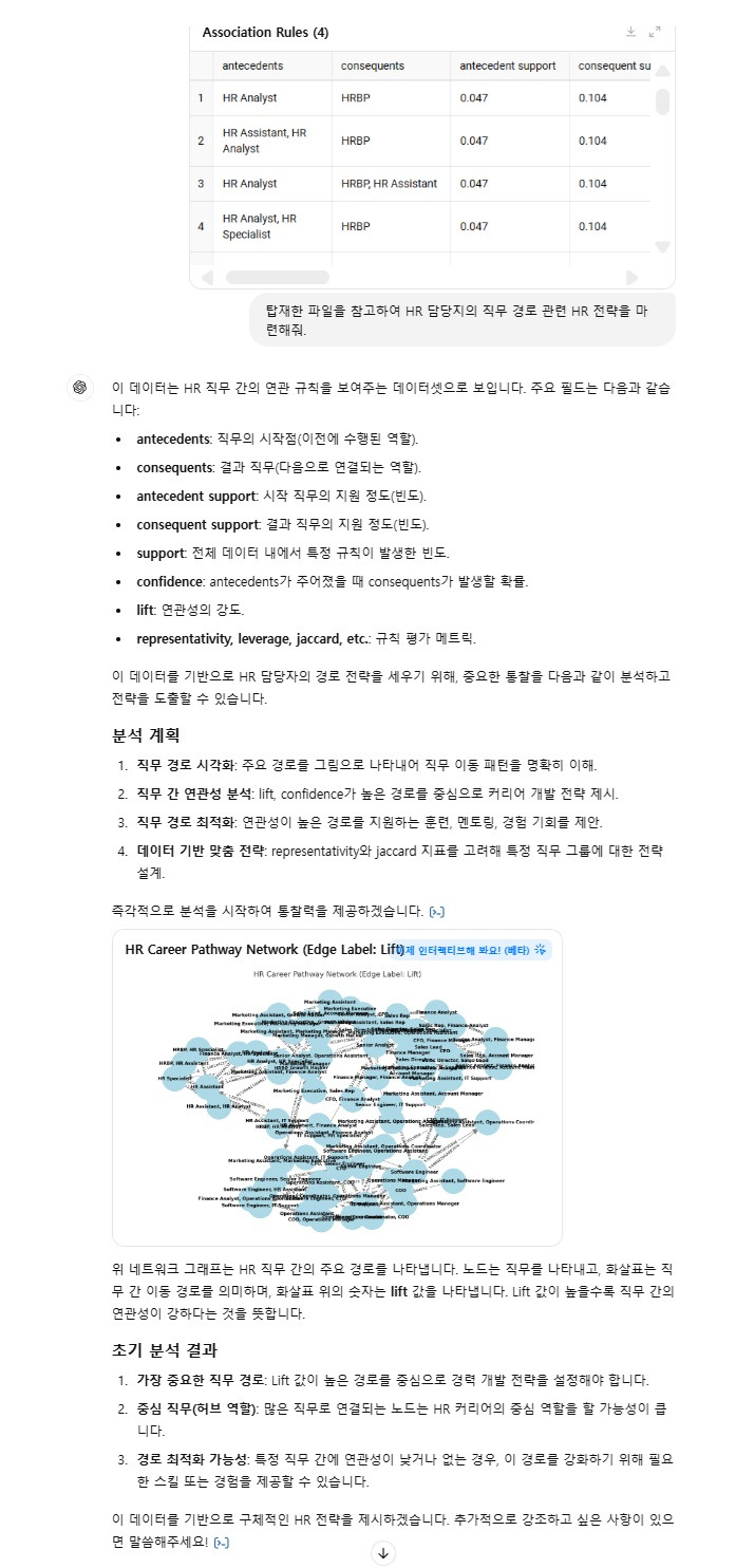 해당 프로그램에서는 연관 분석 결과를 아래와 같은 절차로 다운로드 받을 수 있습니다. 다운로드 받은 CSV 파일을 ChatGPT에게 전달하고 해당 데이터를 기반으로 HR 전략을 수립해달라고 요청하면 아래와 같이 데이터에 기반한 대화를 ChatGPT와 할 수 있습니다.