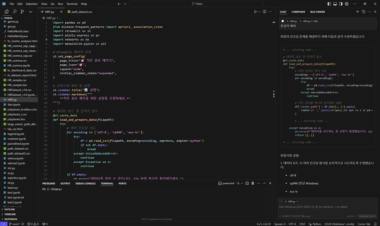 이번 'Cursor AI와 HRA' 매거진에서는 연관 규칙 분석을 활용하여 조직 내 구성원의 직무 이동 경로를 예측하는 방법을 살펴보았습니다. 특히, 장바구니 분석의 원리를 HR 직무 경로 분석에 적용함으로써 데이터 기반의 인재 관리와 직무 설계를 구현하는 방식을 구체적으로 설명하였습니다. 'path_dataset.csv'라는 가상 데이터를 사용하여 연관 규칙 분석을 수행하고, 이를 바탕으로 Streamlit을 이용한 '직무 경로 예측기' 애플리케이션을 개발 및 배포하는 과정을 다루어 보았습니다. 분석 결과, 특정 직무 간의 높은 연관성을 도출하고 이를 시각화함으로써 직무 이동 경로의 전반적인 흐름을 명확히 파악할 수 있었습니다. 특히, 이러한 프로그램을 개발하고 ChatGPT의 도움을 받음으로써 데이터와 코딩 역량이 부족한 담당자도 데이터 기반의 HR 관리를 충분히 수행할 수 있도록 지원할 수 있음을 확인하였습니다.