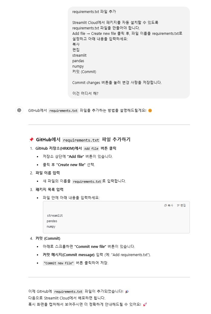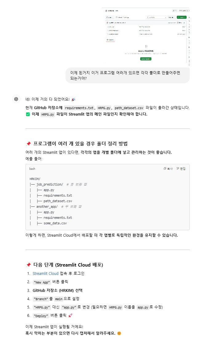 '직무 경로 예측기' 애플리케이션는 Streamlit Cloud에 배포하여 사용자들이 언제 어디서든 접근할 수 있도록 하였습니다. 배포는 Streamlit Community Cloud를 활용하여 진행하였으며, 배포를 위해 Github, Streamlit Cloud 화면을 하나하나 캡쳐를 하며 ChatGPT와 대화를 하며 사용법을 습득하고 무사히 배포할 수 있었습니다. 이러한 과정을 통해 간편하고 효율적으로 앱을 공개할 수 있었습니다.