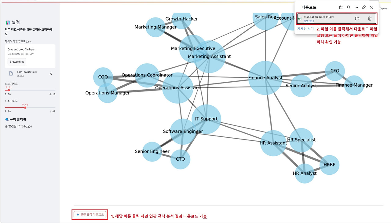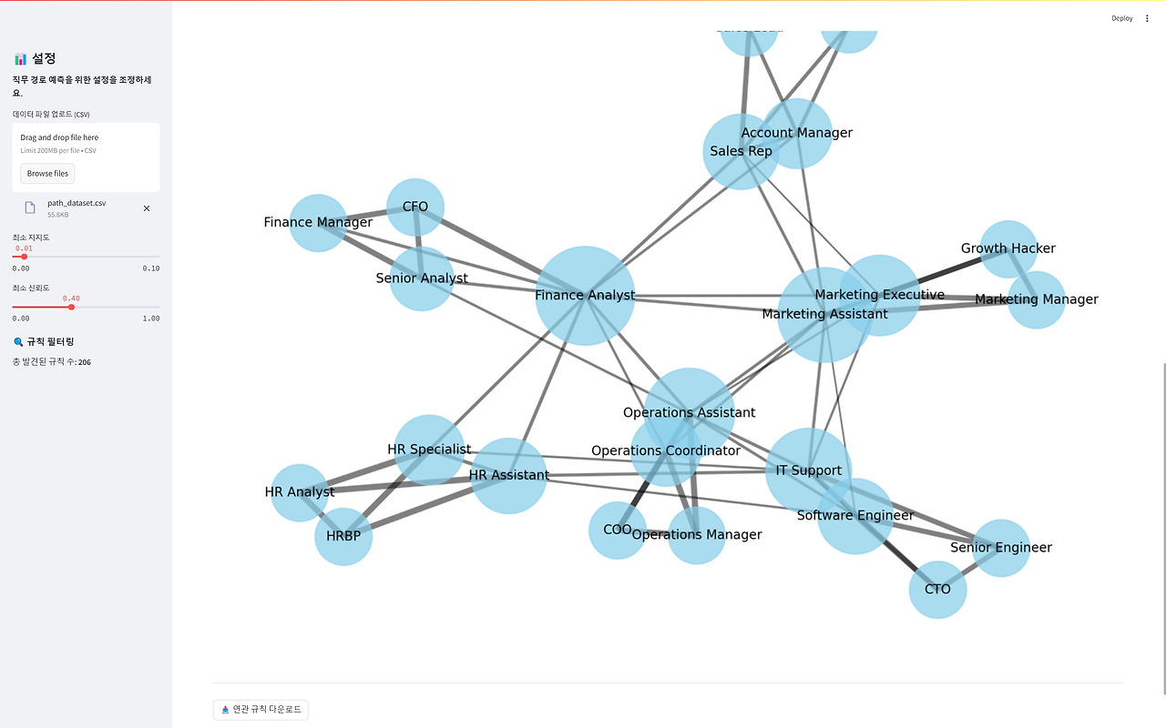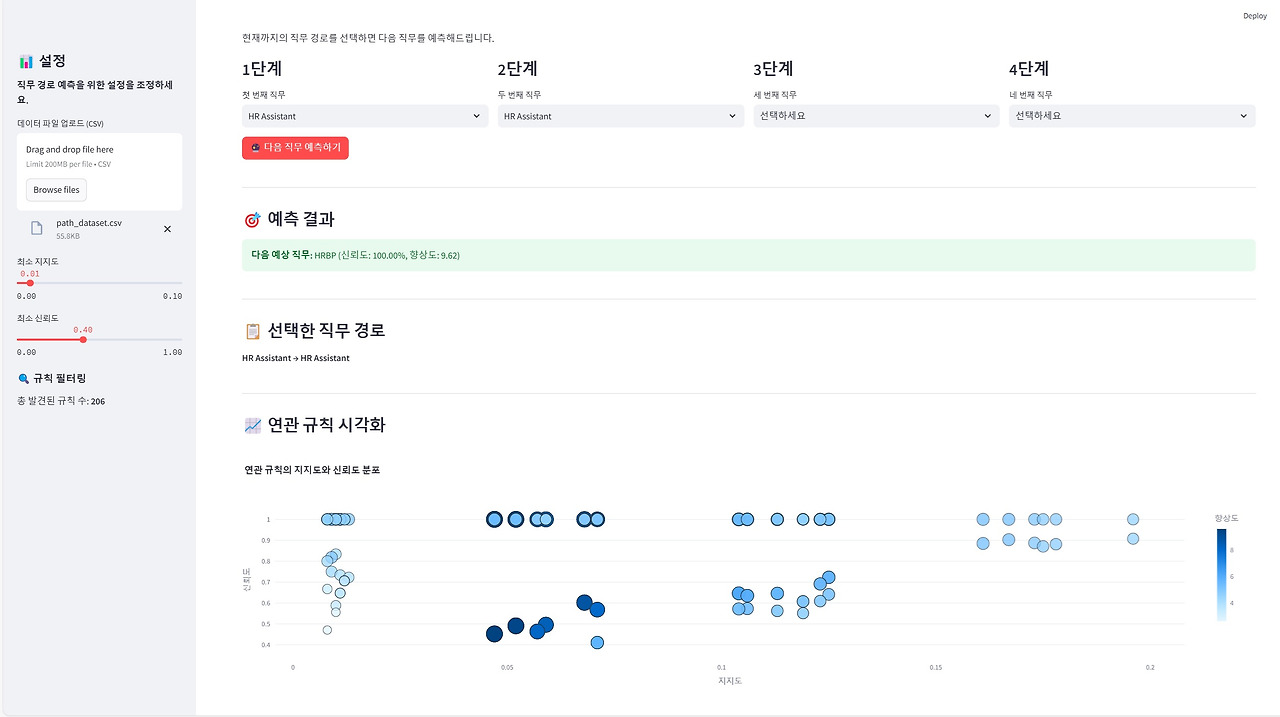 @path_dataset.csv 이 데이터를 연관성분석을 통해서 앱을 하나 만들라고해, 최근 4개의 직무를 넣으면 앞으로 어디로 갈 가능성이 높은지 예측하는 앱을 만들어줘. 분석방법은 연관성분석(Association Rules)야.