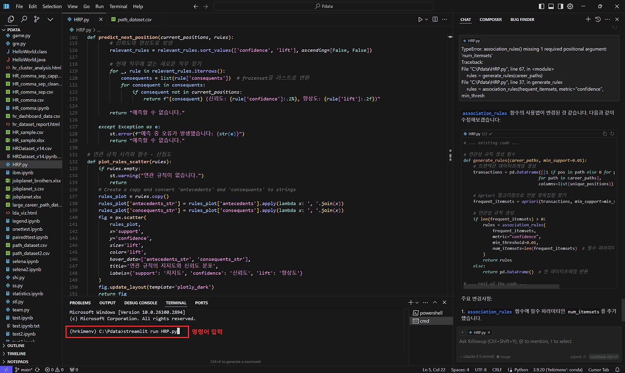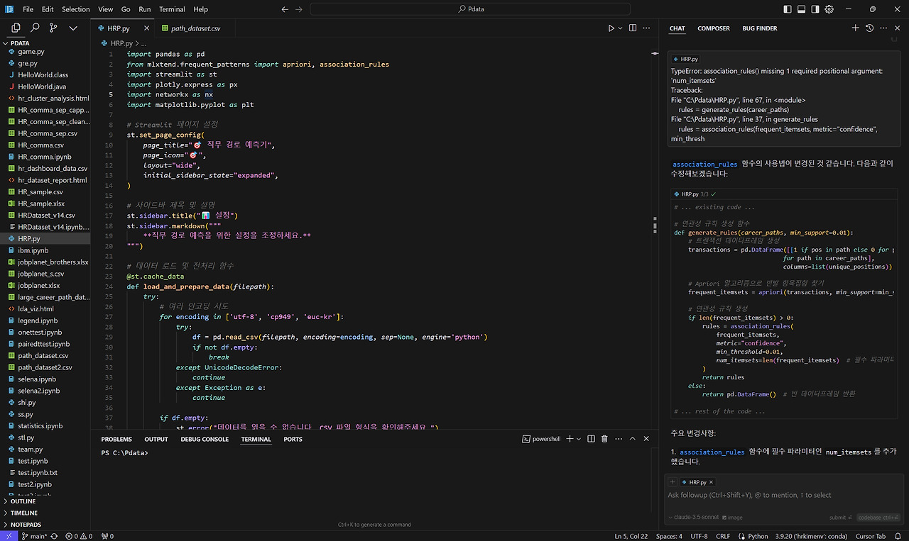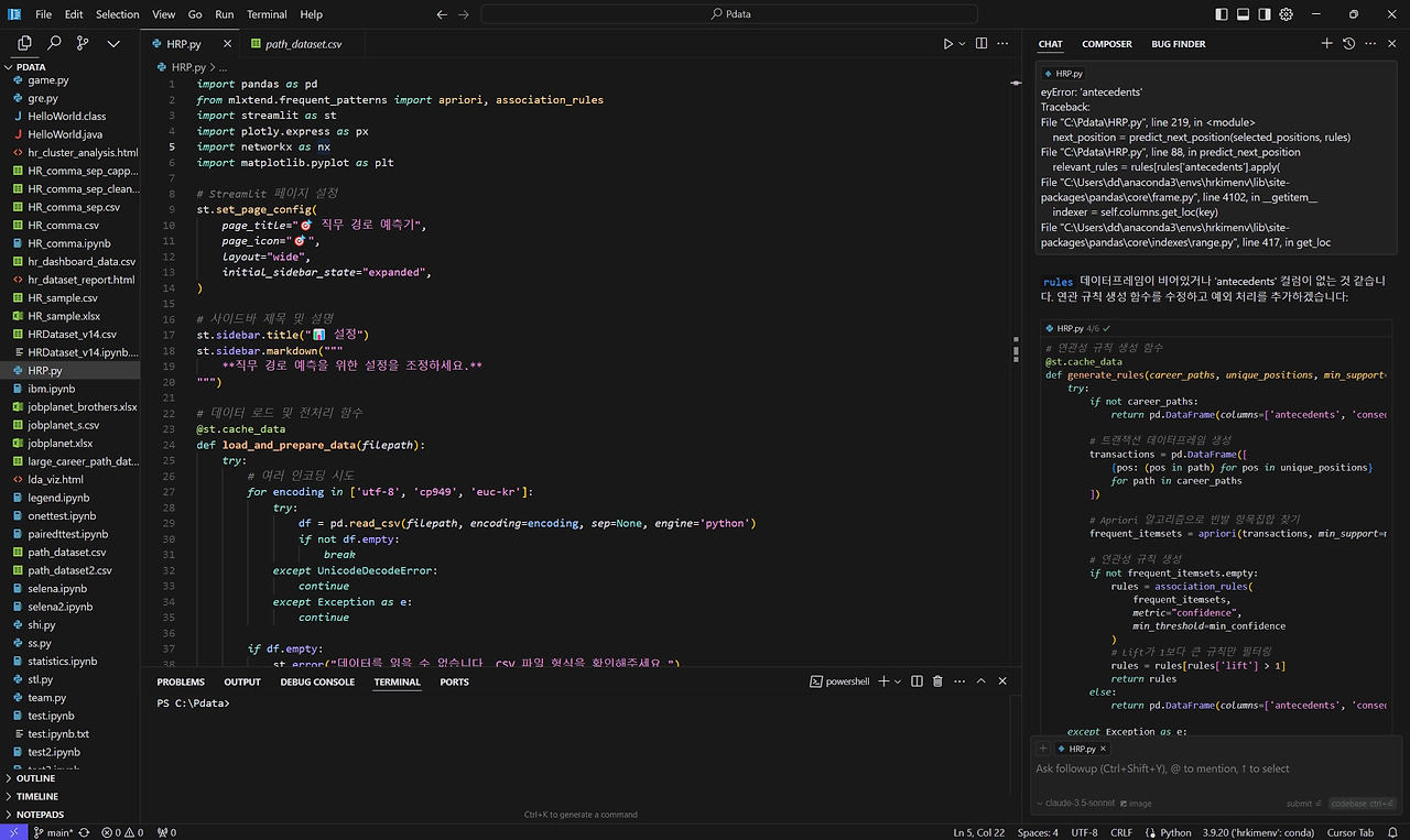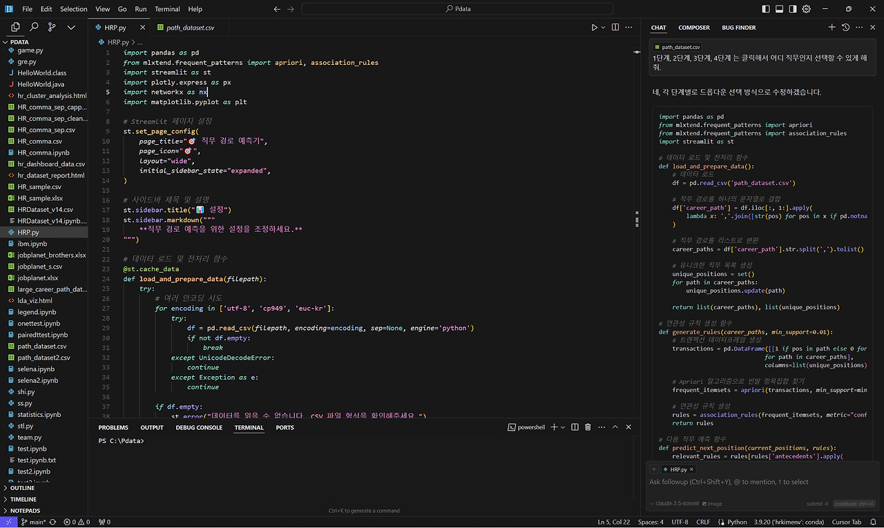 현대 조직에서는 구성원의 직무 이동 경로를 효과적으로 관리하는 것이 경쟁력 확보에 중요한 요소로 작용하고 있습니다. 이를 위해 데이터 마이닝 기법 중 하나인 연관 규칙 분석(Association Rule Analysis)을 활용할 수 있습니다. 이번 'Cursor AI와 HRA' 매거진에서는 연관 규칙 분석을 HR 직무 경로 예측에 적용하는 방법을 구체적으로 소개하고, 더 나아가 이를 실제 애플리케이션으로 개발 및 배포하는 과정을 다루고자 합니다. 이를 통해 코딩이나 데이터 분석 경험이 없는 담당자도 데이터 기반의 인재 관리를 실현할 수 있는 실질적인 방법론을 제시하고자 합니다.