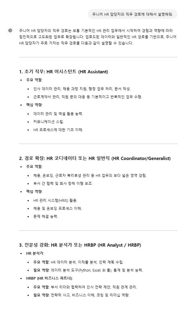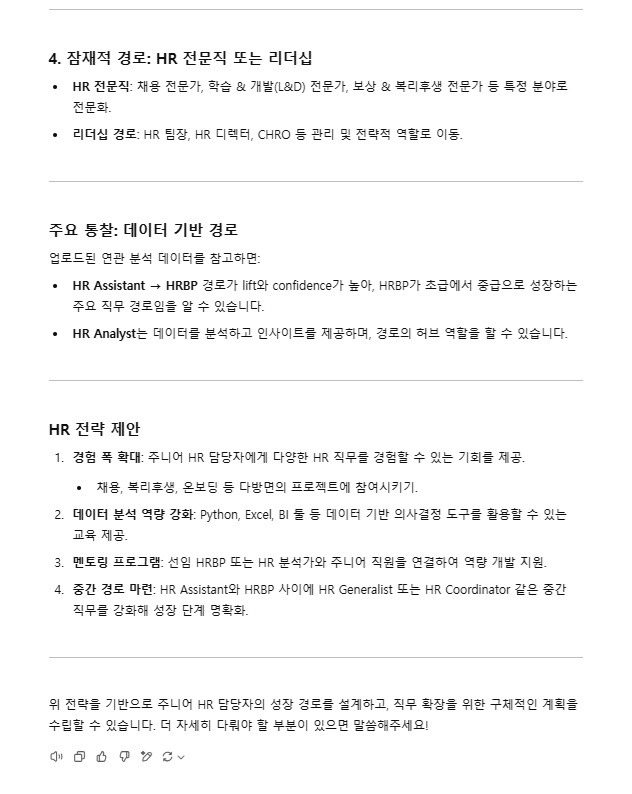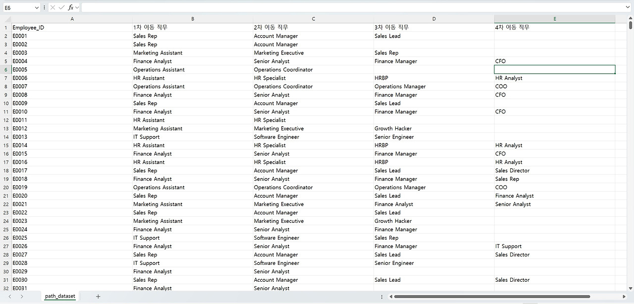 이번 분석에는 'path_dataset.csv' 데이터 파일을 활용하였습니다. 해당 데이터는 생성형 AI를 이용해 가상으로 제작한 데이터셋입니다. 여러분께서 재직 중인 조직에서도 이와 같은 구성원의 직무 이동 경로 데이터를 보유하고 있을 가능성이 높습니다. 만약 이 데이터와 동일한 형식으로 구성원들의 이전 경로 데이터를 정리한다면, 조직에 맞는 직무 경로 예측 모델을 구축할 수 있습니다. 이를 통해 조직 내 직무 이동 경향을 파악하고, 전략적인 인재 관리 방안을 마련할 수 있을 것입니다.
