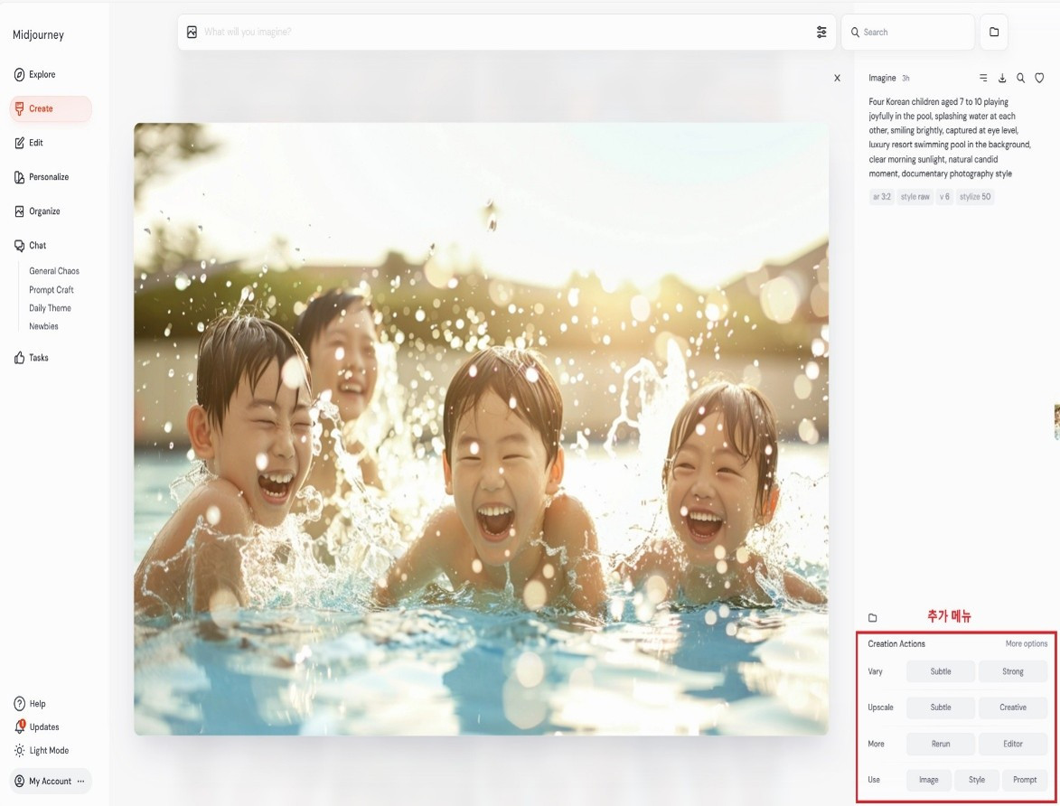 Midjourney는 이미지를 생성한 후에도 추가 편집과 재구성이 가능합니다. 편집과 재구성을 위해서는 아래 화면중 하단에 위치한 ‘Creation Actions’ 메뉴를 활용하면 됩니다. 이 메뉴는 사용자가 결과물을 더욱 만족스럽게 만들 수 있도록 돕는 도구들로 구성되어 있으며, 크게 네 가지 주요 기능으로 나눌 수 있습니다.