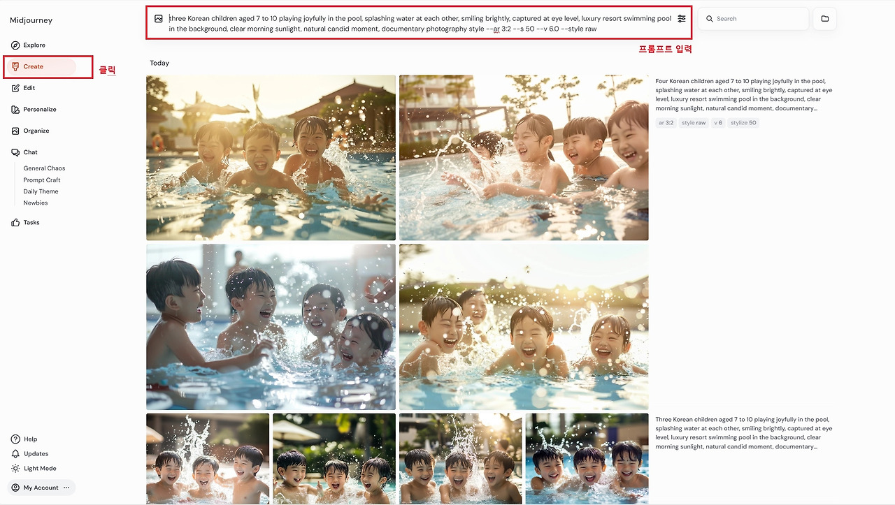 위 화면과 같이 GPT와의 대화를 통해 입력한 요소들은 마지막에 하나의 완성된 프롬프트 문장으로 정리되며, 이를 버튼 한 번으로 간편하게 복사할 수 있습니다. 복사한 프롬프트는 Midjourney 웹사이트의 Create 창에 그대로 붙여 넣기만 하면 이미지 생성이 가능합니다.