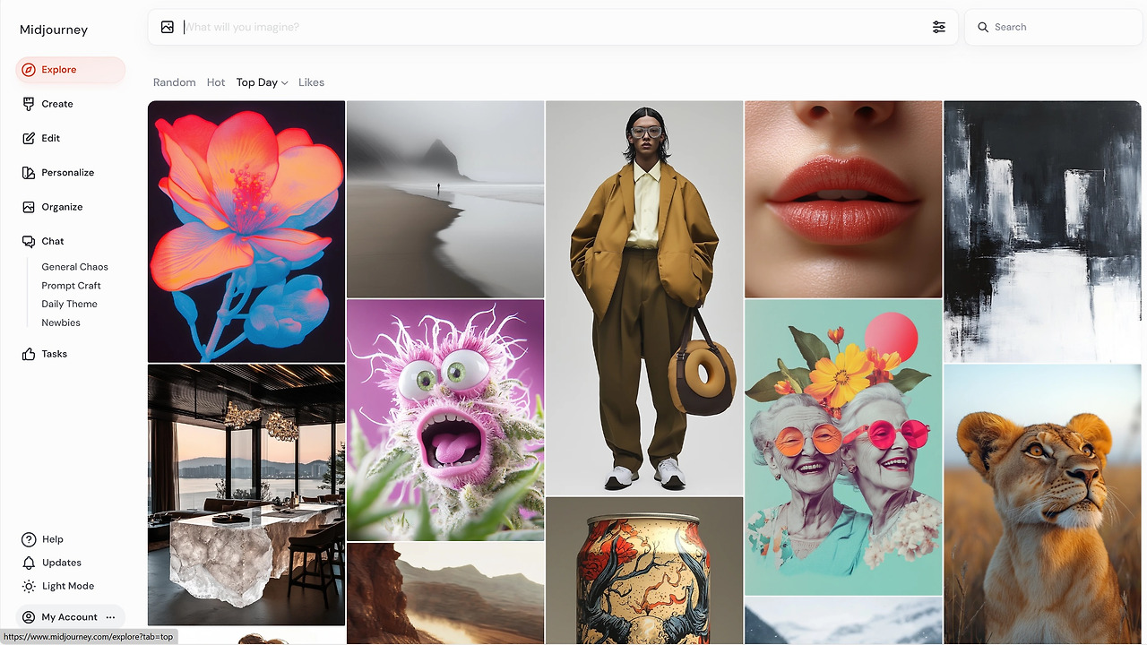 왼쪽 사이드바에는 주요 기능 메뉴가 배치되어 있습니다. ‘Explore’는 위 화면처럼 다른 사용자가 생성한 이미자를 살펴볼 수 있는 공간이며, ‘Create’에서는 사용자가 직접 프롬프트를 입력하여 이미지를 생성할 수 있는 공간입니다. ‘Edit’ 메뉴는 유료 플랜에서 활성화되는 기능으로, 업로드한 이미지를 편집할 수 있습니다. 또한 ‘Personalize’에서는 나만의 선호 스타일을 설정할 수 있고, ‘Organize’는 사용자가 기존 생성한 이미지를 관리할 수 있습니다. ‘Chat’ 항목에서는 General Chaos, Prompt Craft, Daily Theme, Newbies 등 다양한 커뮤니티 채널에 참여할 수 있습니다.