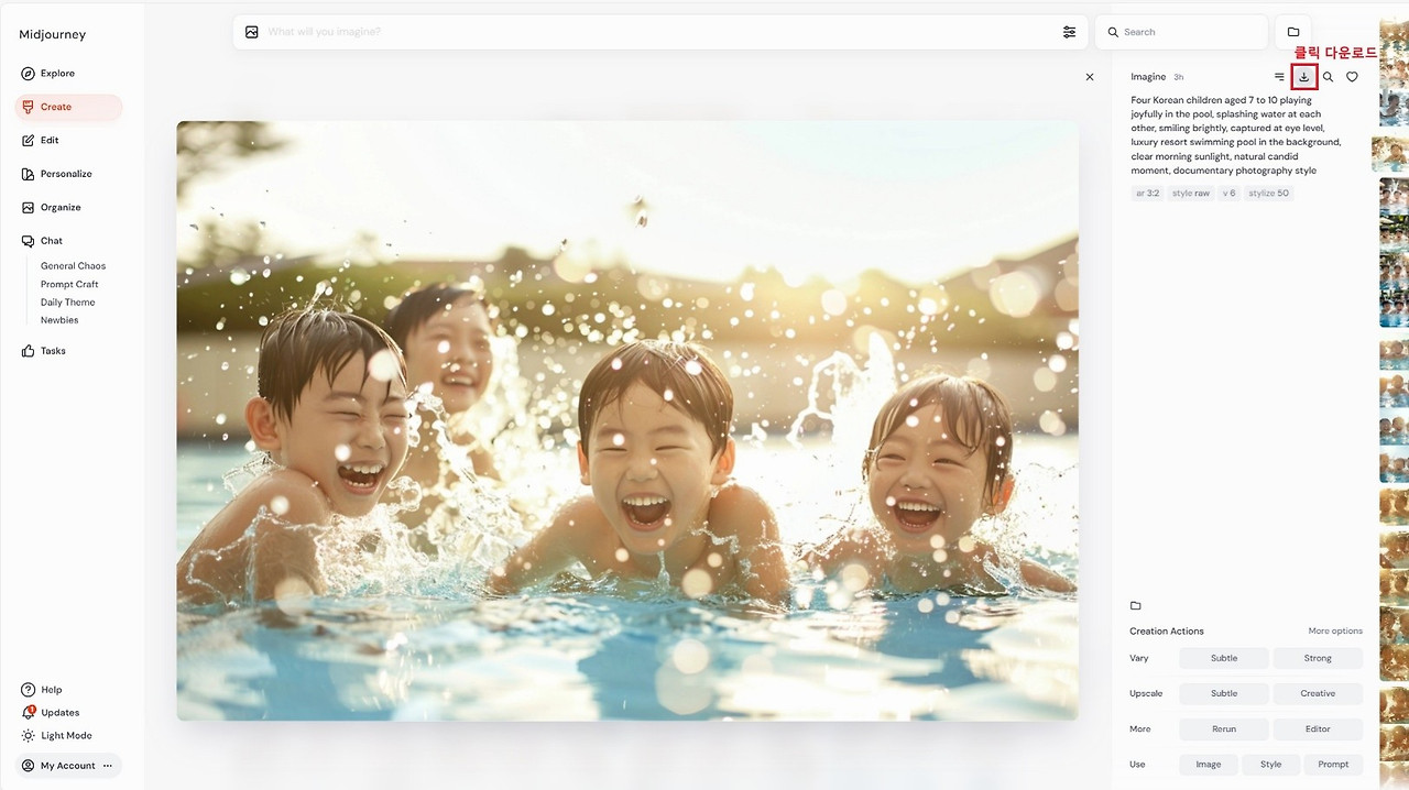 ChatGPT 좌측 메뉴에서 ‘GPTs 탐색’을 클릭한 뒤, 검색창에 ‘Midjourney’를 입력하면 관련 GPT가 나타납니다. 그중 저는 ‘MIDJOURNEY v7.0 | RAW’를 활용해 보았습니다. 이 GPT는 Midjourney에 사용할 수 있는 고급 프롬프트를 단계적으로 제작해 주는 도구로, 프롬프트에 필요한 핵심 요소들을 차례대로 질문하며 구성해 줍니다. 예를 들어, “아이들이 수영장에서 수영하고 있는 모습을 실사처럼 그려줘”라고 입력하면, 스타일, 구도, 배경, 조명 등을 세부적으로 물어본 뒤 이를 하나의 완성된 영어 프롬프트로 정리해 주기 때문에, 초보자도 쉽게 고퀄리티 프롬프트를 작성할 수 있습니다.