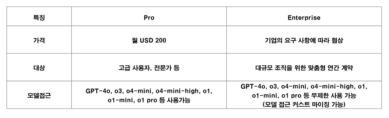 Enterprise 플랜은 대규모 조직을 위한 맞춤형 연간 계약 상품으로, GPT-4o와 함께 GPT-4.5(리서치 프리뷰), o3, o4-mini, o4-mini-high, o1, o1-mini, o1 Pro 등 다양한 모델을 빠르고 안정적으로 사용할 수 있습니다. 대규모 작업도 끊김 없이 처리할 수 있는 성능을 제공하며, 보존 기간을 설정할 수 있는 데이터 관리 기능, 전담 기술 지원팀, 조직 전용 작업 공간 등 기업 업무에 최적화된 기능을 포함하고 있습니다.