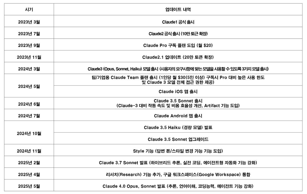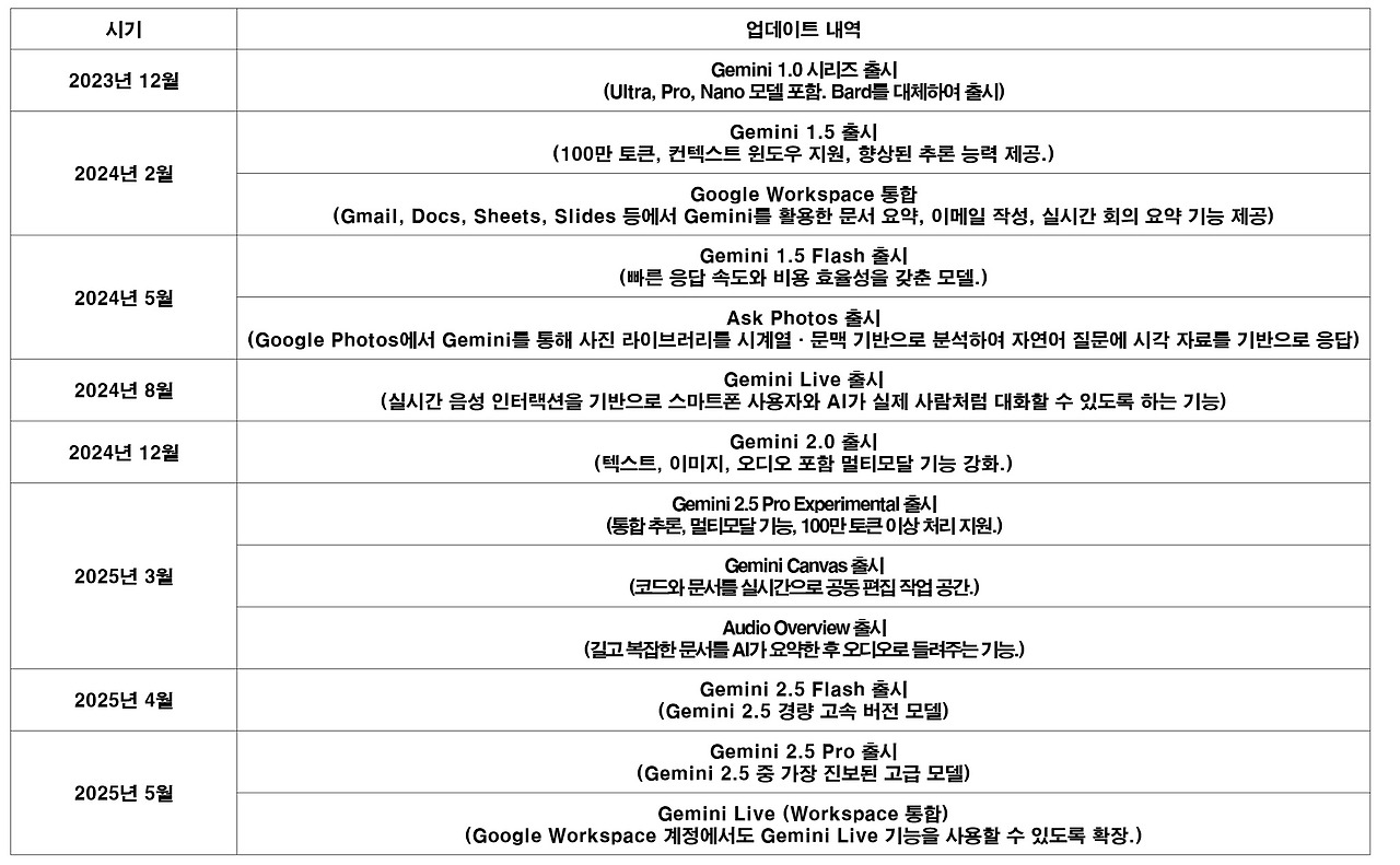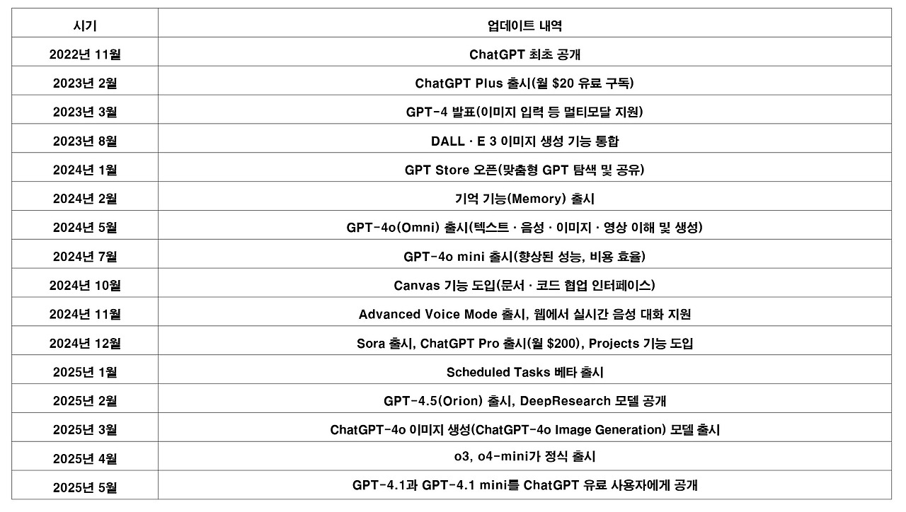 위 세 가지 모델은 2025년에도 계속해서 업데이트를 통해 기능과 성능을 증진시키며 상호 경쟁하고 있습니다. 세 가지 모델의 2024년~2025년 업데이트 트렌드를 살펴보면 다음과 같습니다.