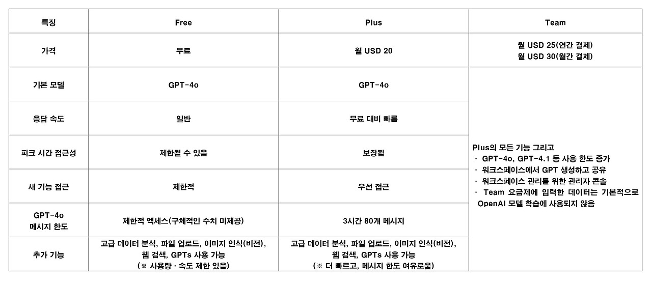 Free 플랜은 누구나 무료로 사용할 수 있으며, 기본적으로 GPT-4o를 제한된 범위에서 제공합니다. 응답 속도는 일반적이며, 피크 시간에는 사용이 제한될 수 있습니다. 또한 고급 기능(예: 고급 데이터 분석, 파일 업로드, 이미지 분석, 웹 검색 등)은 일부 제한적으로만 제공됩니다. GPT-4o의 메시지 한도는 비공개이지만, 일정량 이상 사용 시 자동으로 GPT-4.1 mini로 전환됩니다.