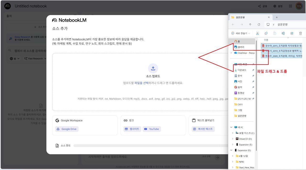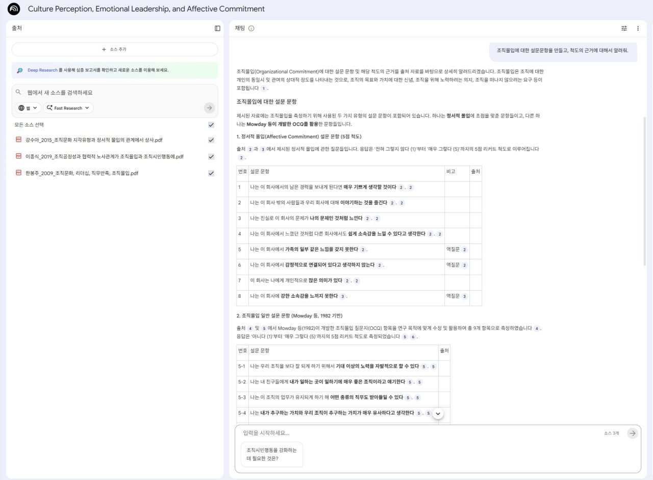 확보한 논문들을 그대로 읽고 정리하기엔 시간이 부족합니다. 이때 구글의 NotebookLM을 활용하면 생산성이 비약적으로 상승합니다. 다운로드한 논문 PDF 파일들을 업로드한 뒤, 단순히 "설문을 만들어달라"가 아니라 다음과 같이 요청해 보세요.