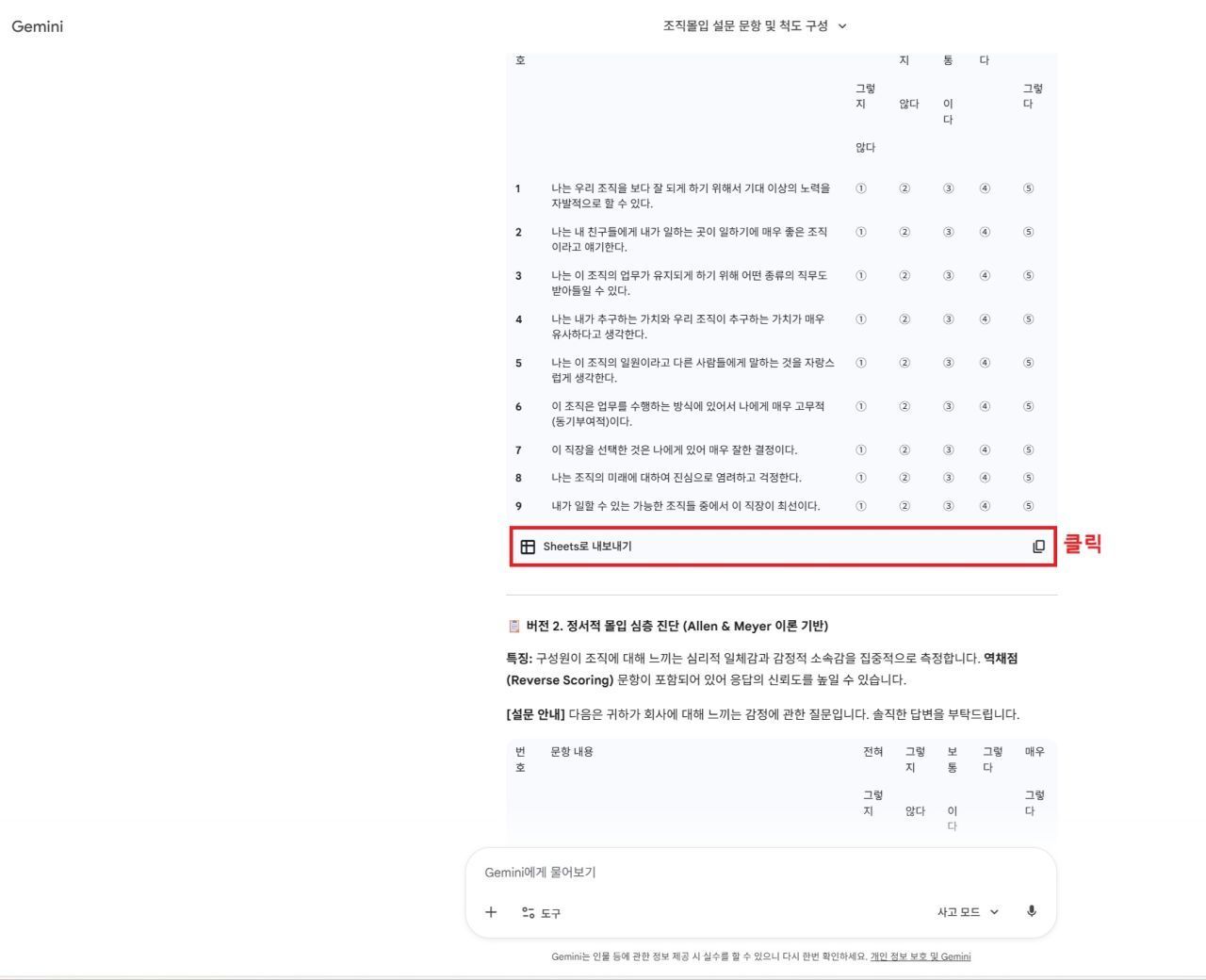 특히 Gemini의 강력한 기능 중 하나인 'Google Sheets로 내보내기'를 활용하면, 확정된 문항들을 즉시 스프레드시트로 옮길 수 있습니다. 이를 통해 설문지 폼을 구성하거나 동료들과 공유하는 시간을 획기적으로 단축할 수 있습니다.