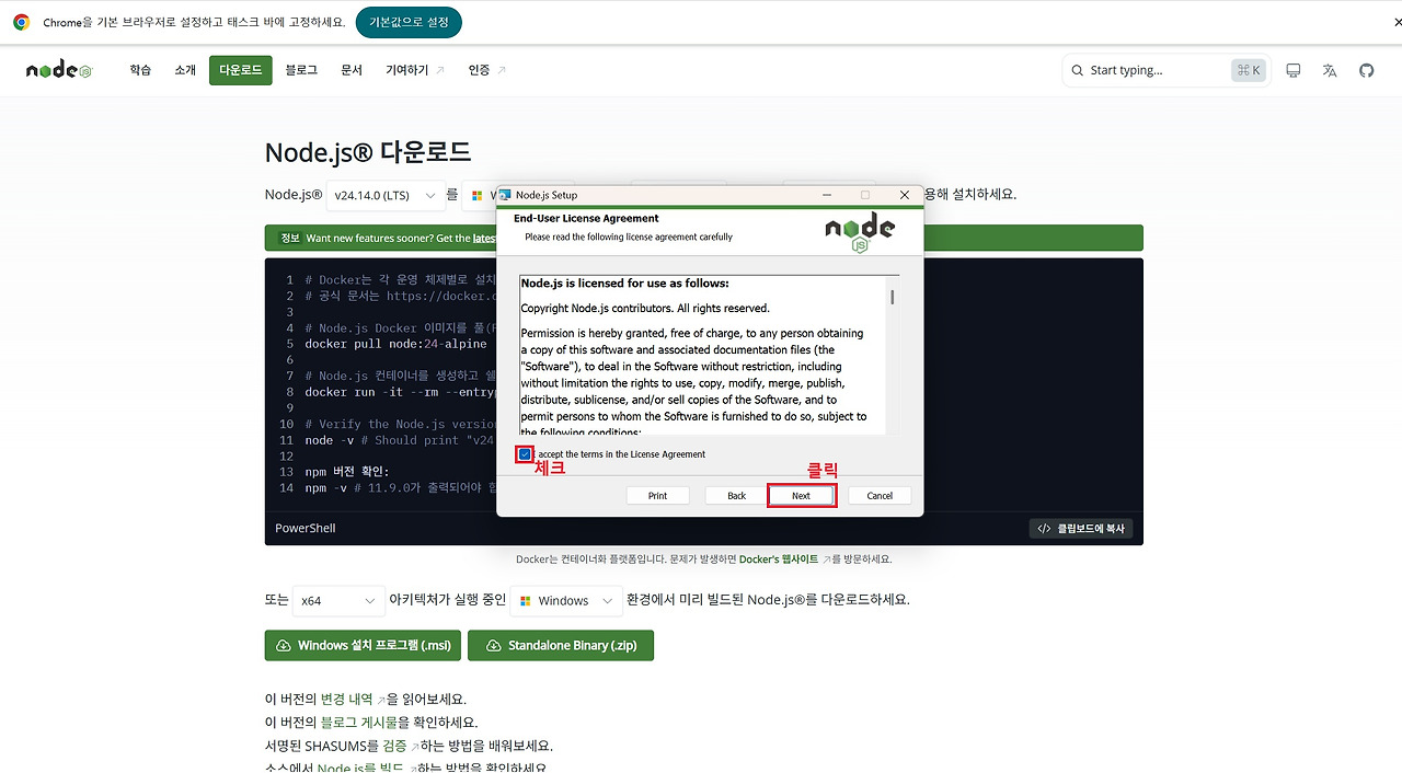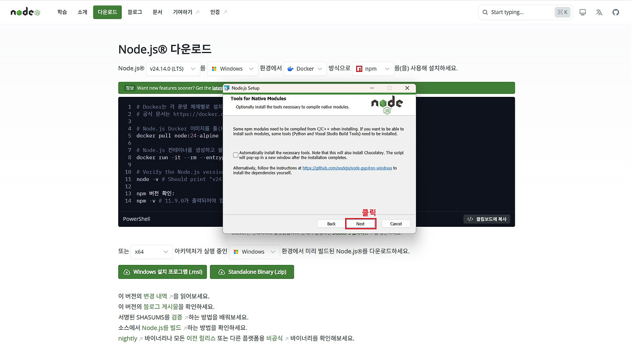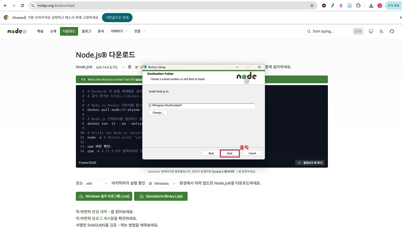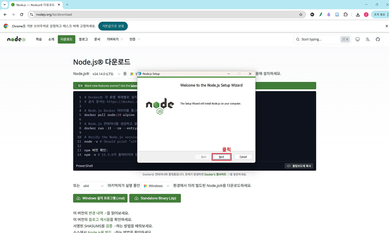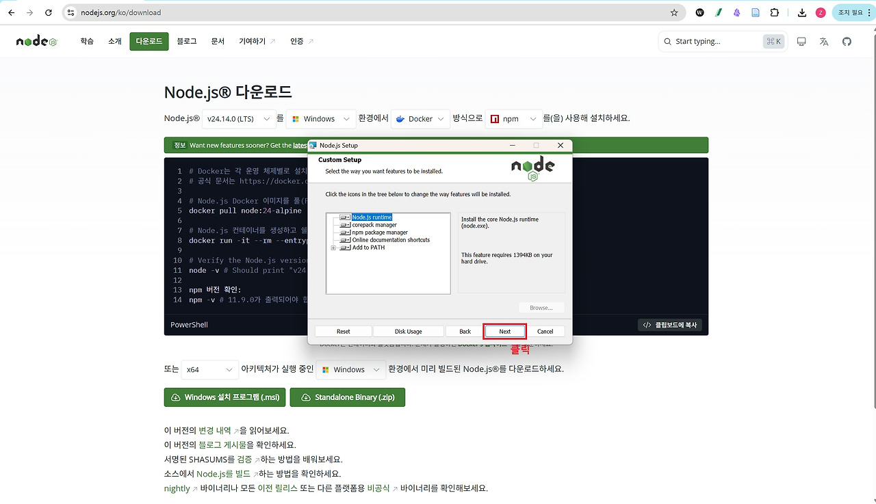 Node.js는 위 링크를 통해 홈페이지에 접속하여 아래 이미지 순서대로 설치하시면 됩니다. 설치할 때는 모두 기본 설정값으로 Next를 클릭하며 진행하면 어려움 없이 설치하실 수 있습니다.